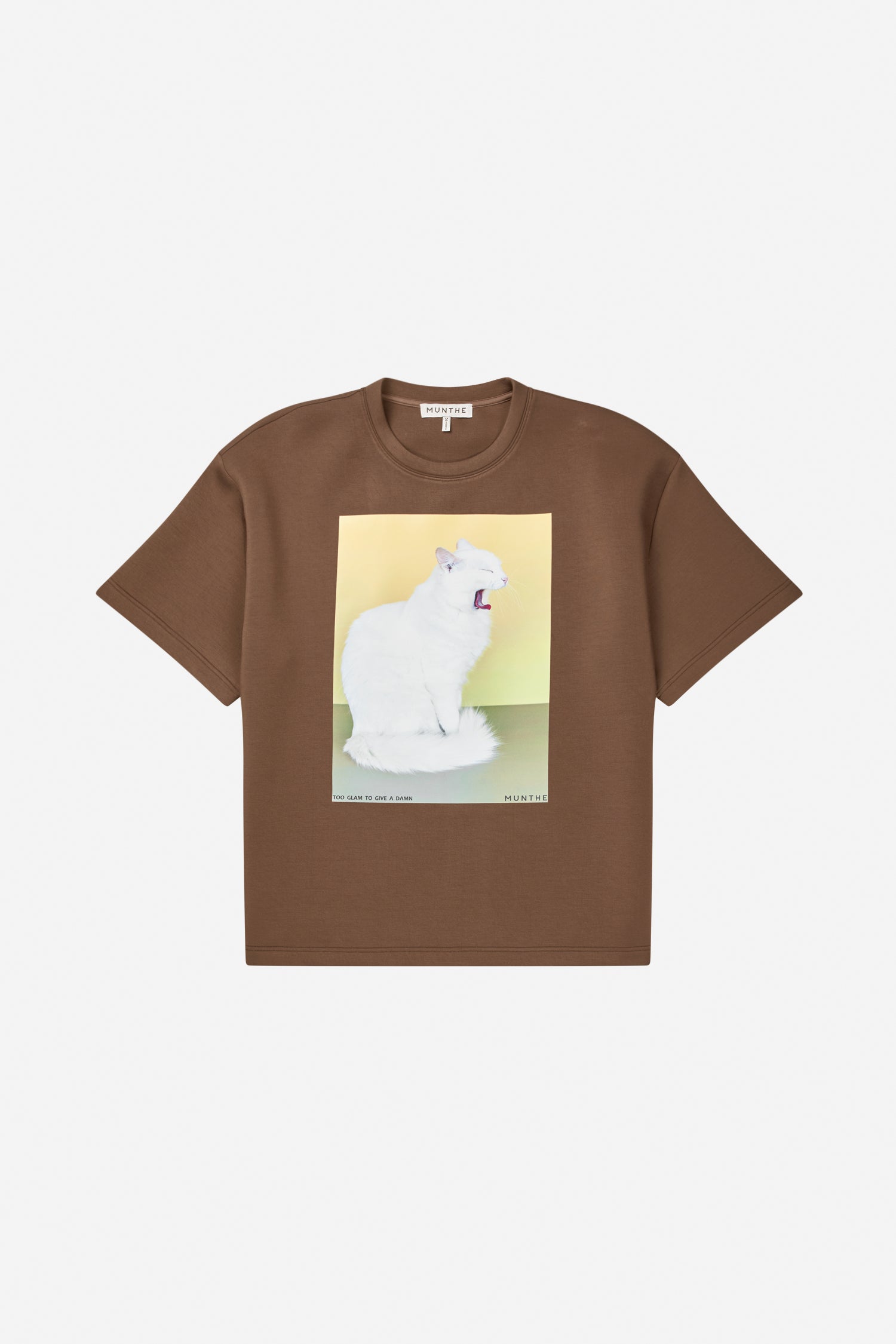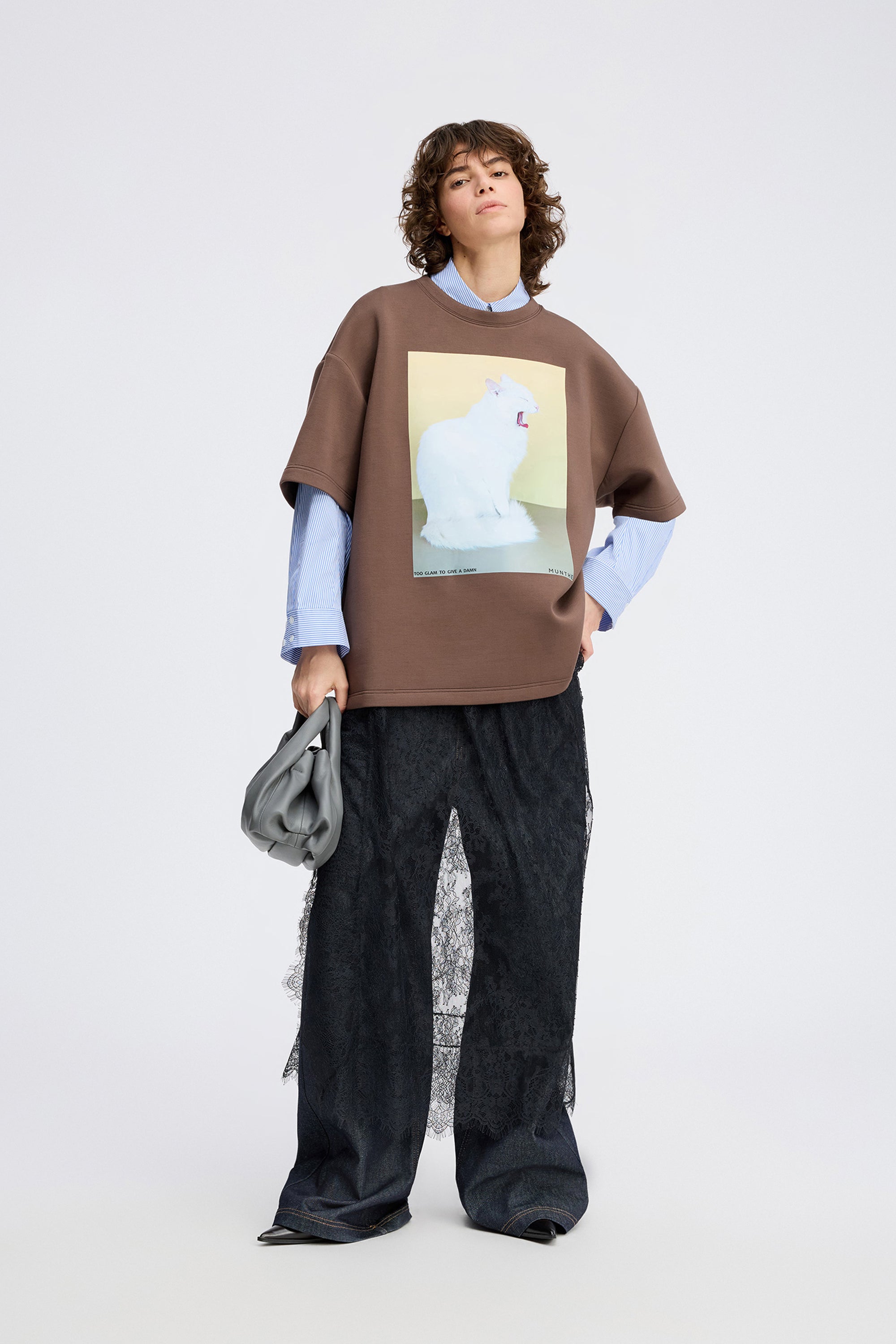 Neoprene blouse with an elegant cat print. This blouse is oversized, has short sleeves, and a round neckline.