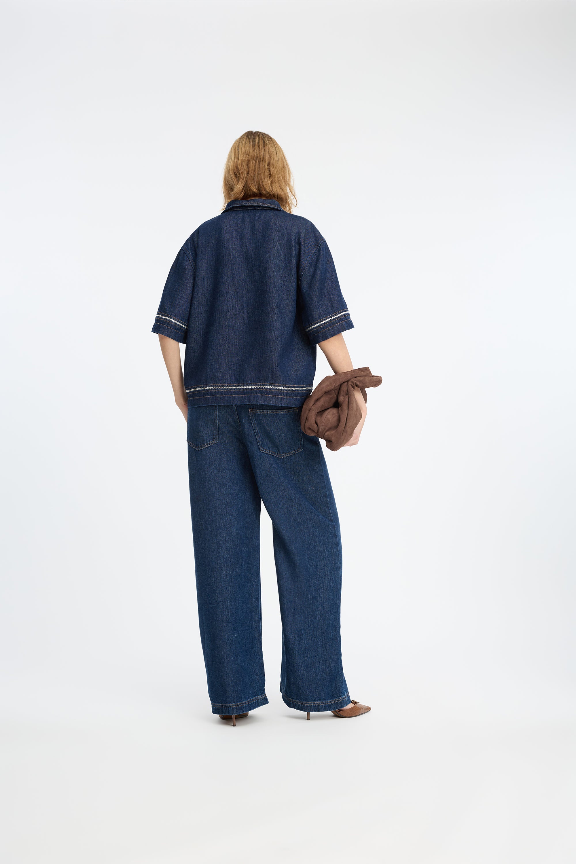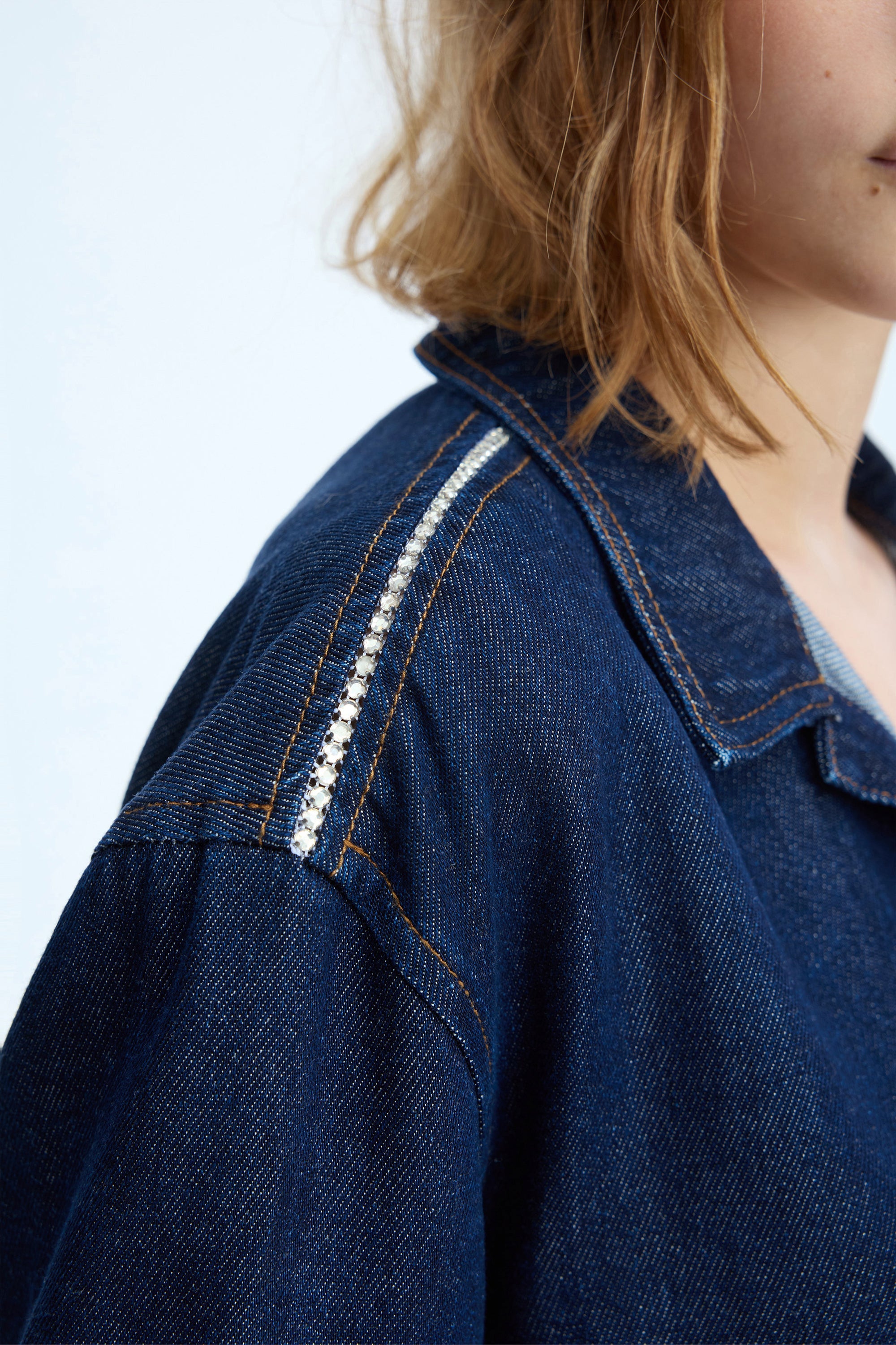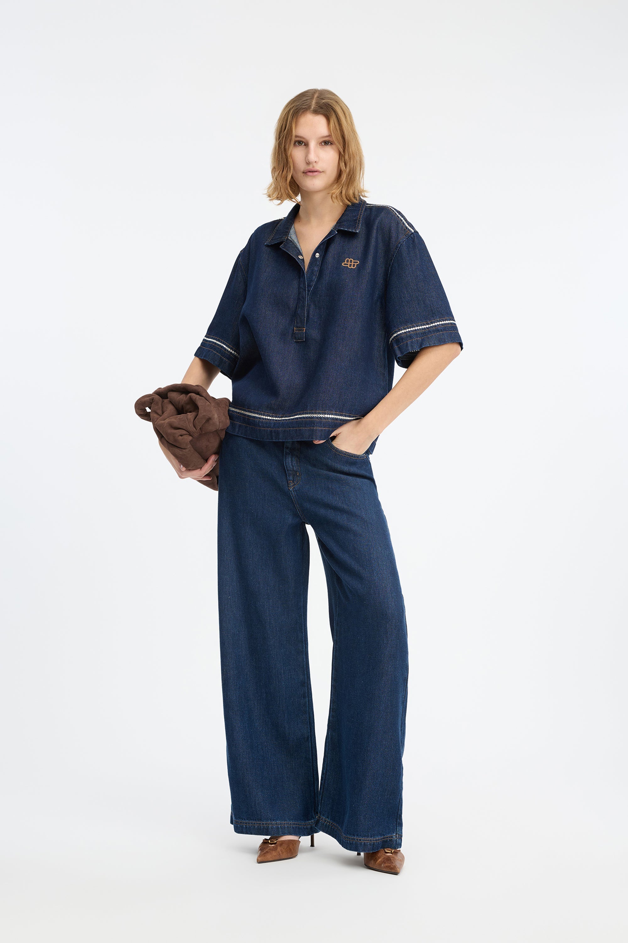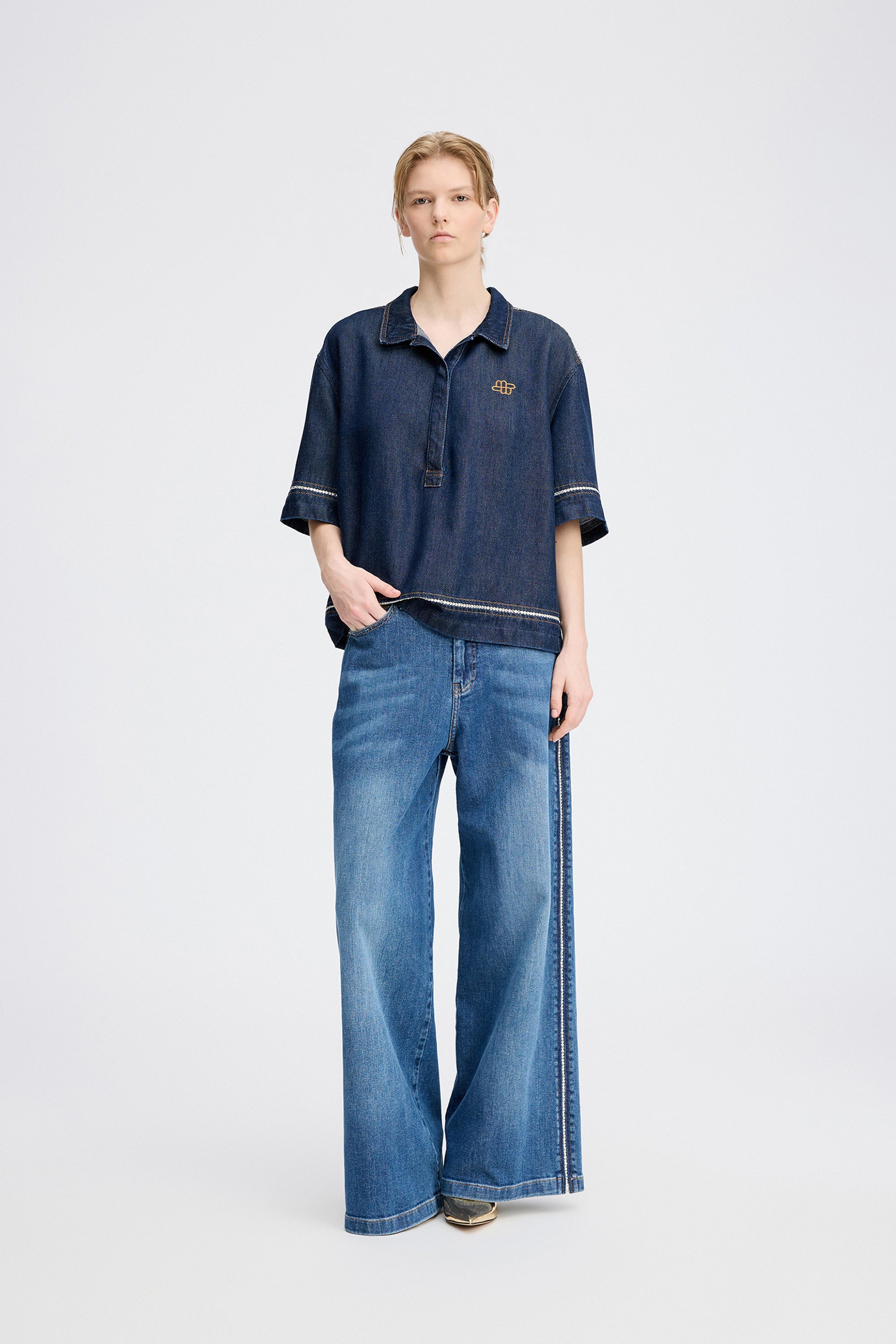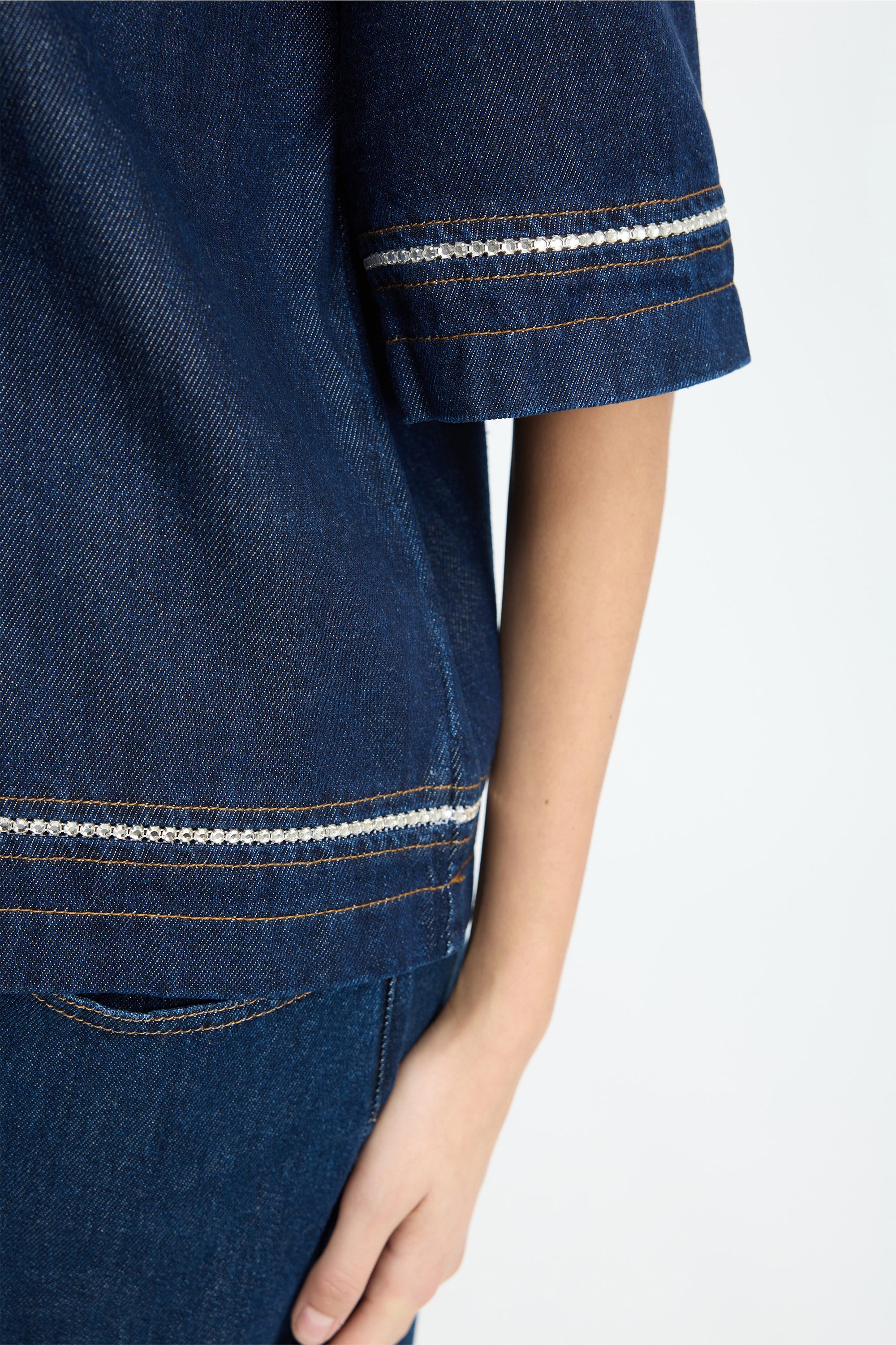 Beautiful denim blouse with decorative rhinestones and contrast stitching. The blouse features short sleeves, a classic collar, a half button placket, and a small embroidered emblem on the chest.