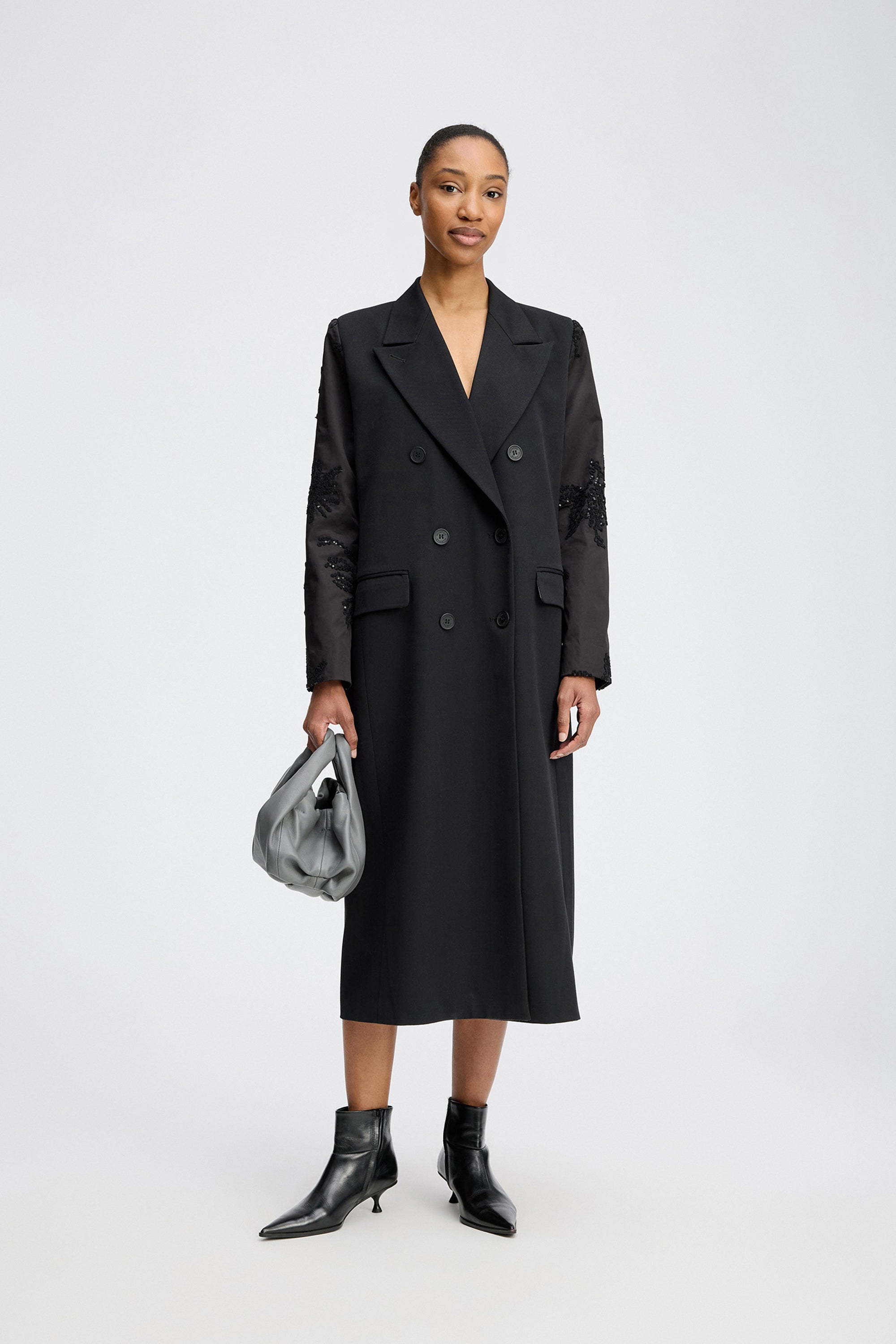 Long black blazer coat with a double-breasted closure and elegant embroidered sleeves adorned with tone-on-tone sequins and beads. Designed with a classic lapel, flap pockets, and a straight, sophisticated silhouette.