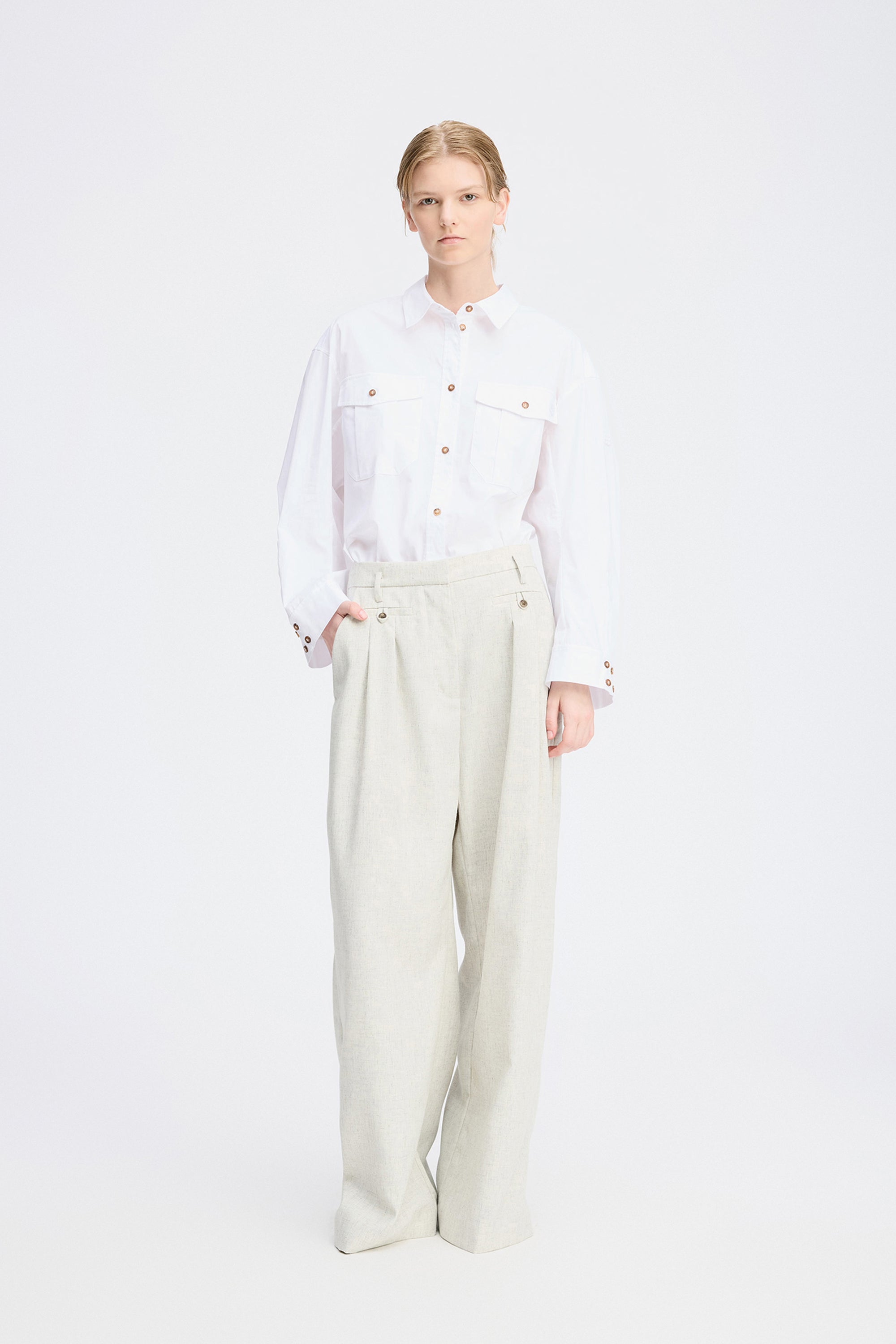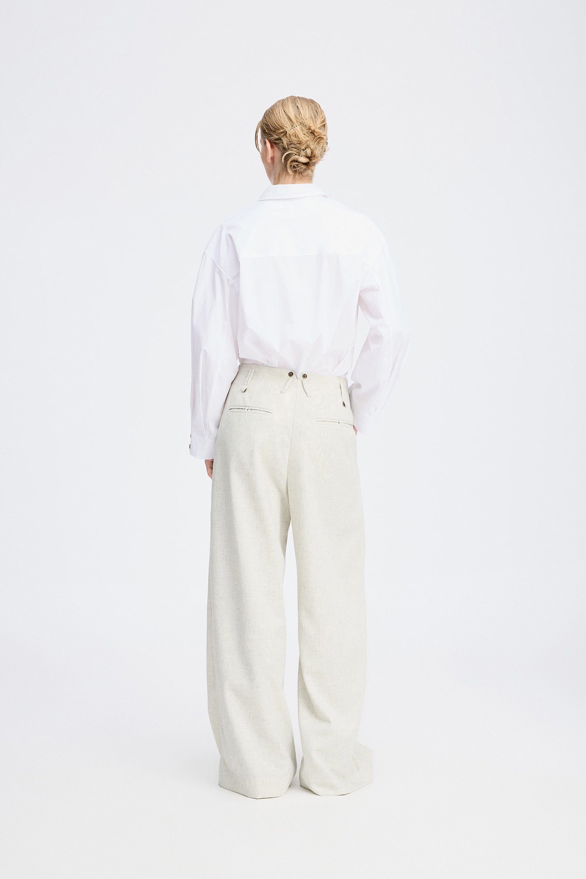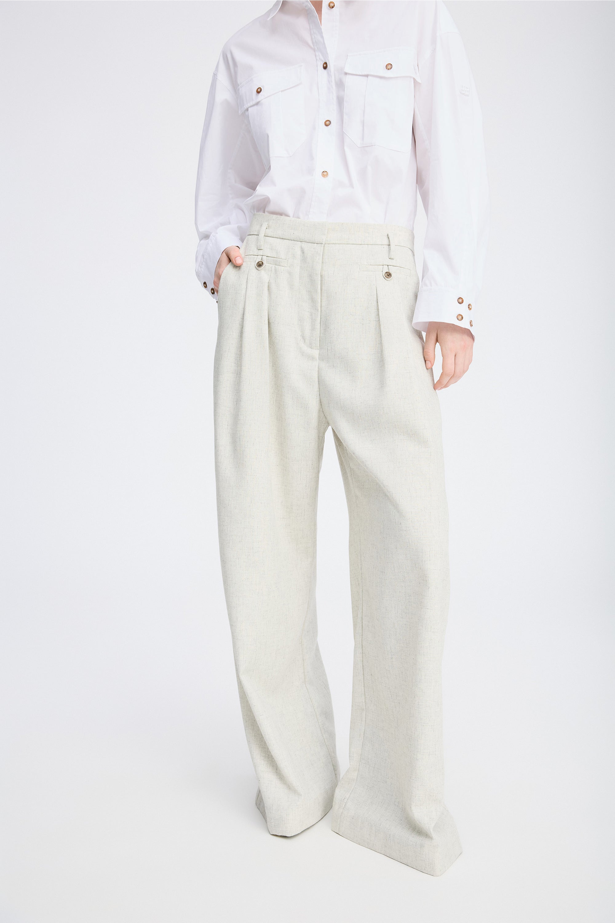 Elegant trousers in a structured fabric with wide legs. These pants are designed with a high waist, front pleats, slanted side pockets, and welt back pockets with a button.