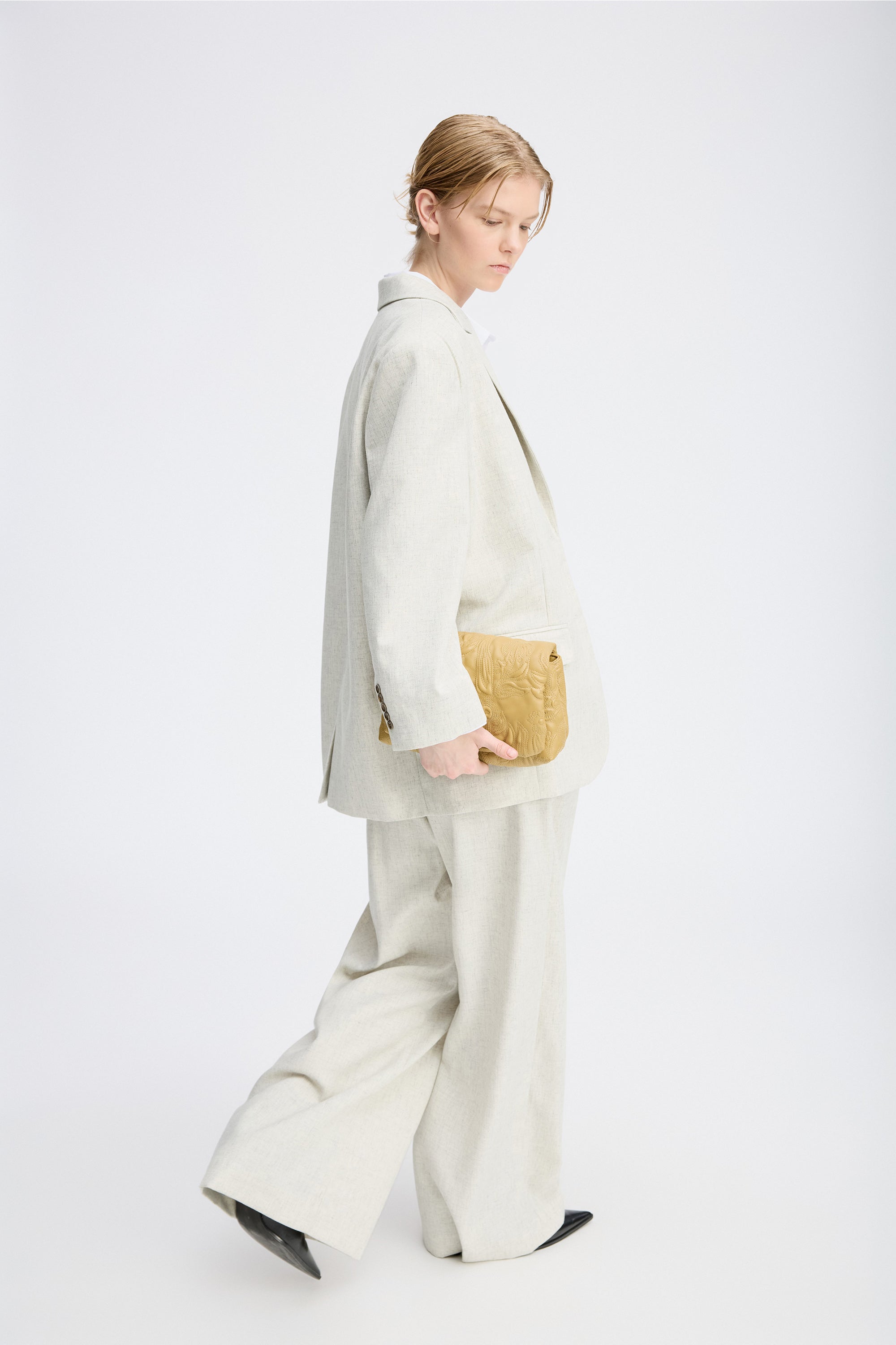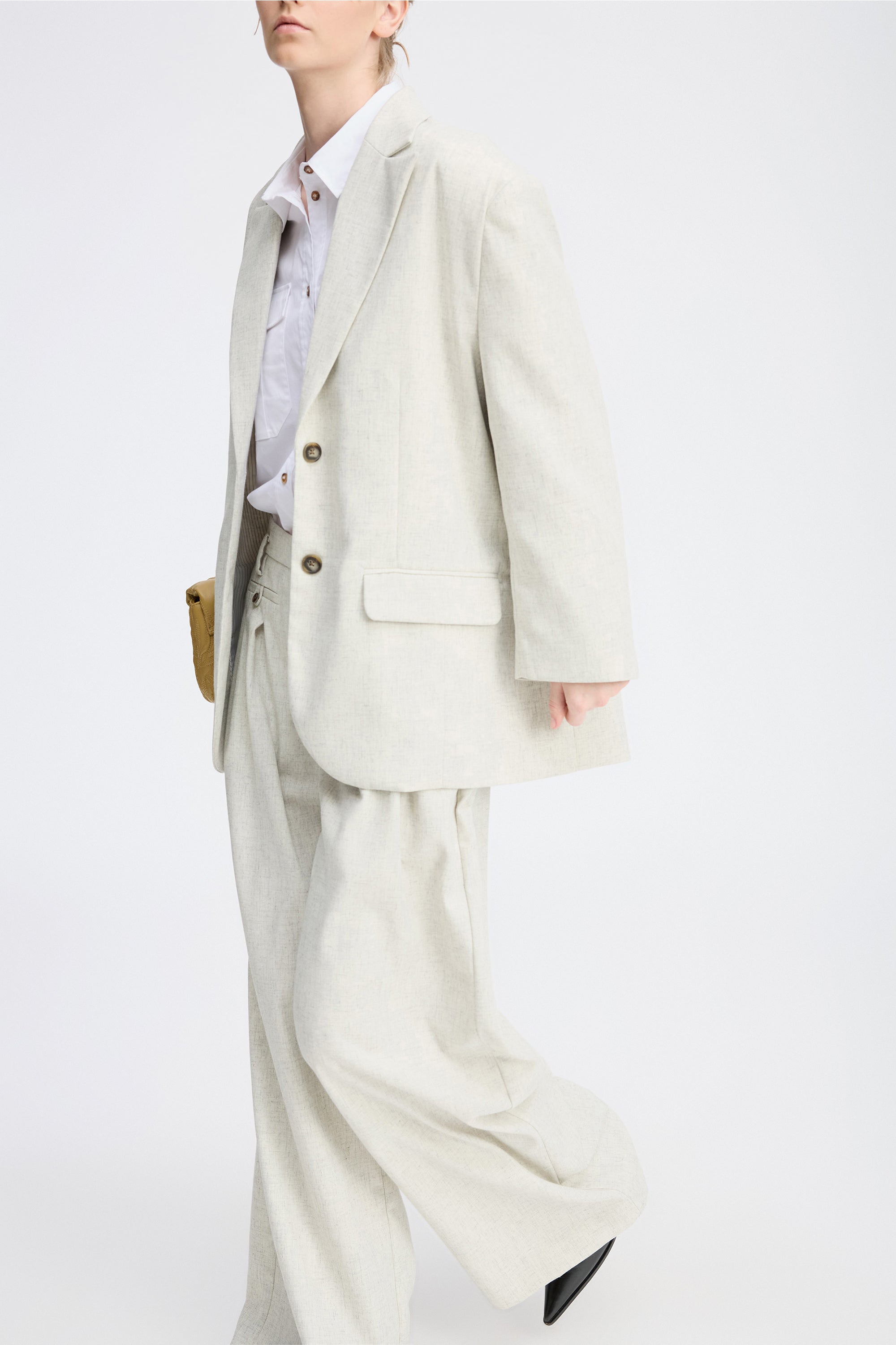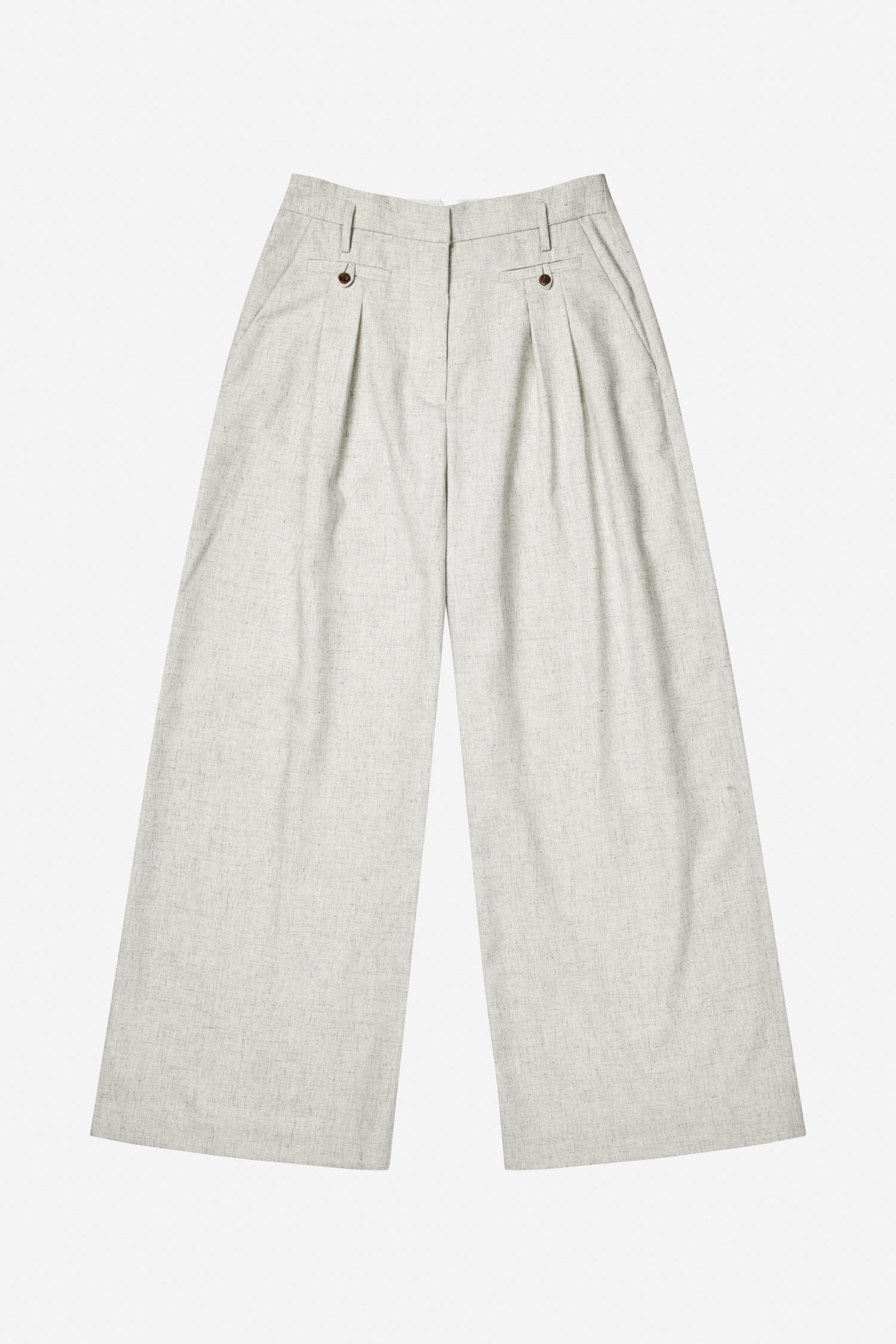 Elegant trousers in a structured fabric with wide legs. These pants are designed with a high waist, front pleats, slanted side pockets, and welt back pockets with a button.