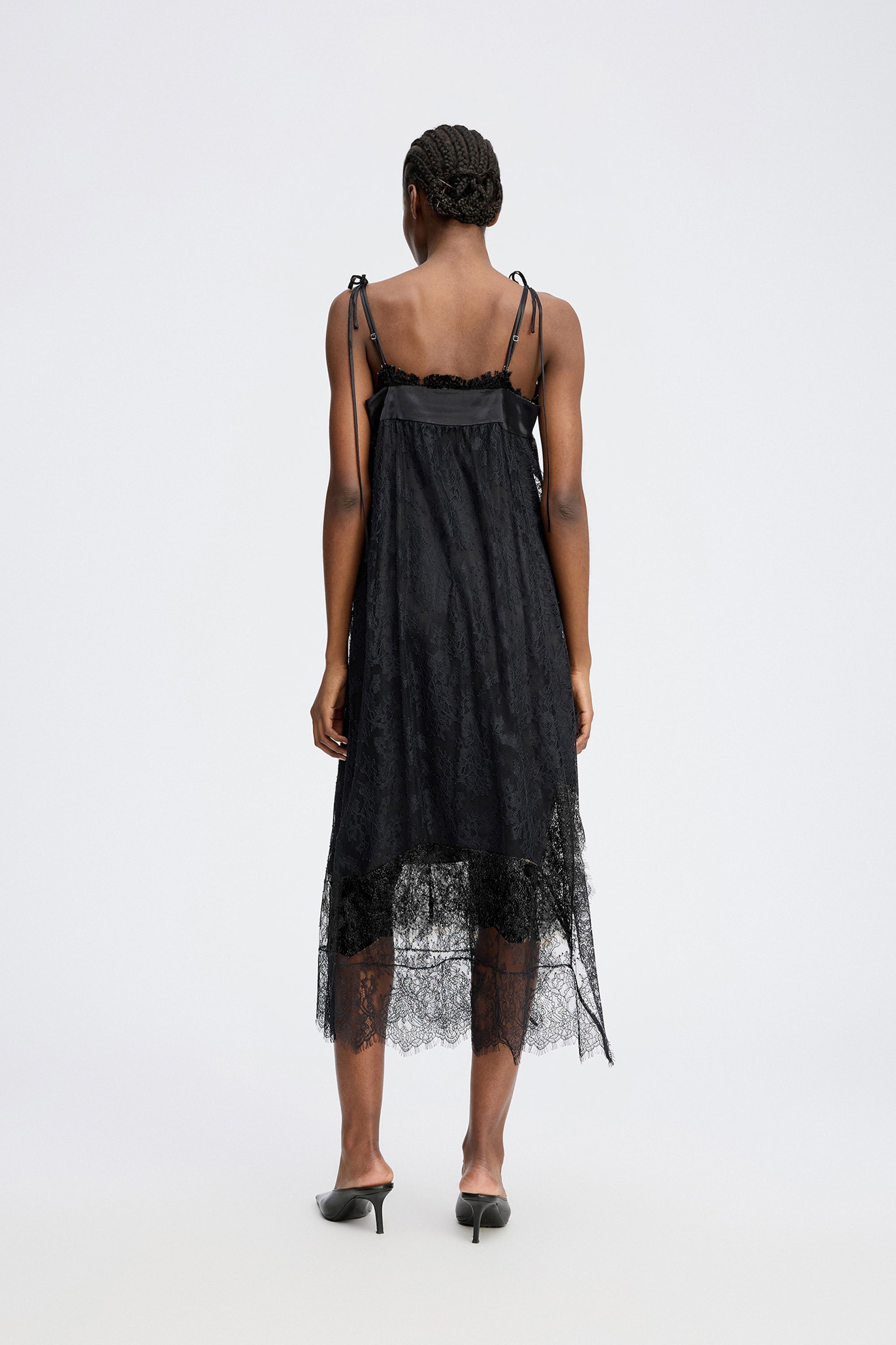 Beautiful lace dress with an elegant ribbon detail at the neckline and delicate tie straps on the shoulders. The dress features an asymmetric lace hem. This versatile piece can be styled with or without a slip dress.