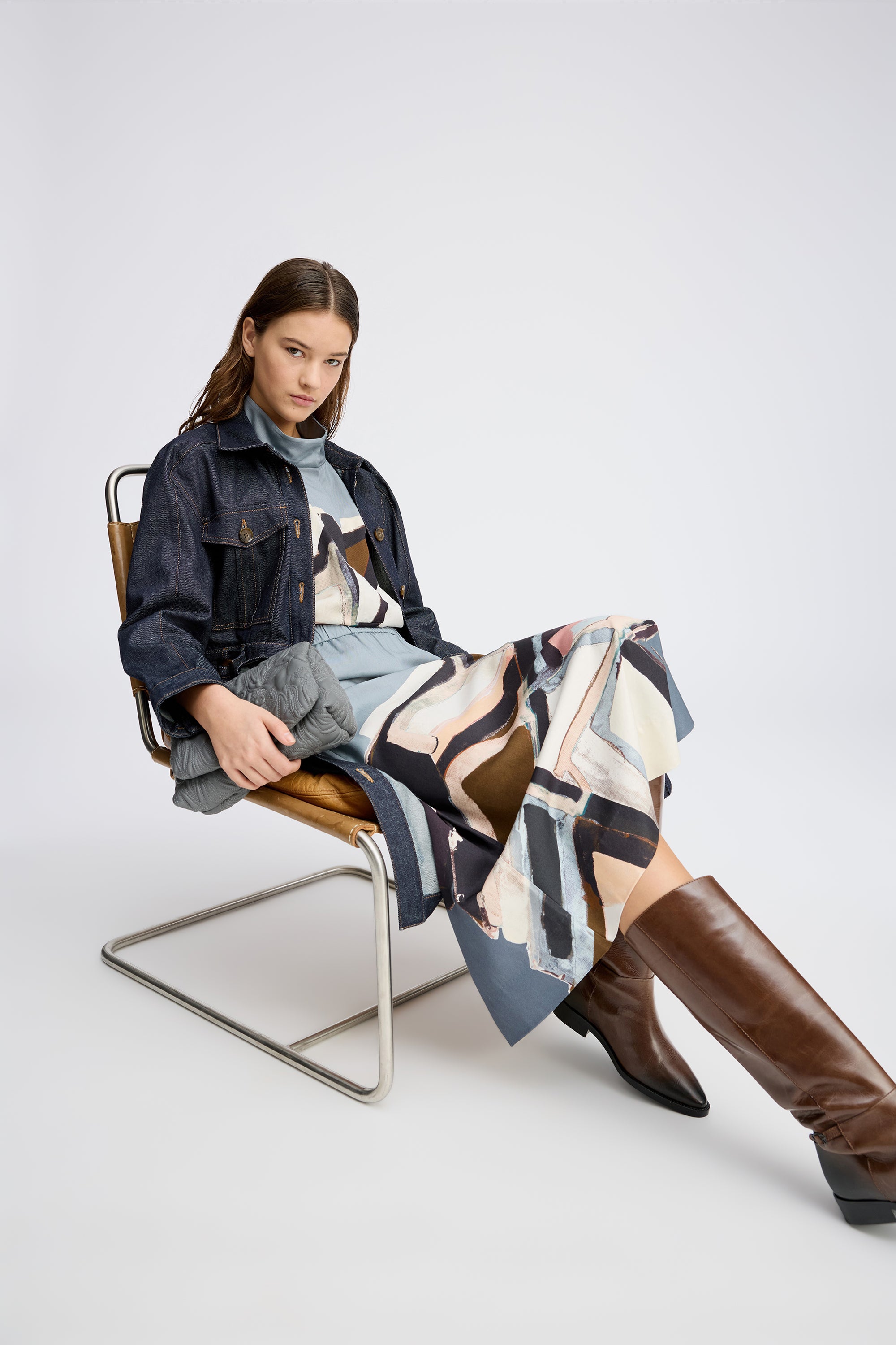 Beautiful skirt with an elegant abstract graphic print. Designed with an elastic waistband, a slit, and stylish side pockets.