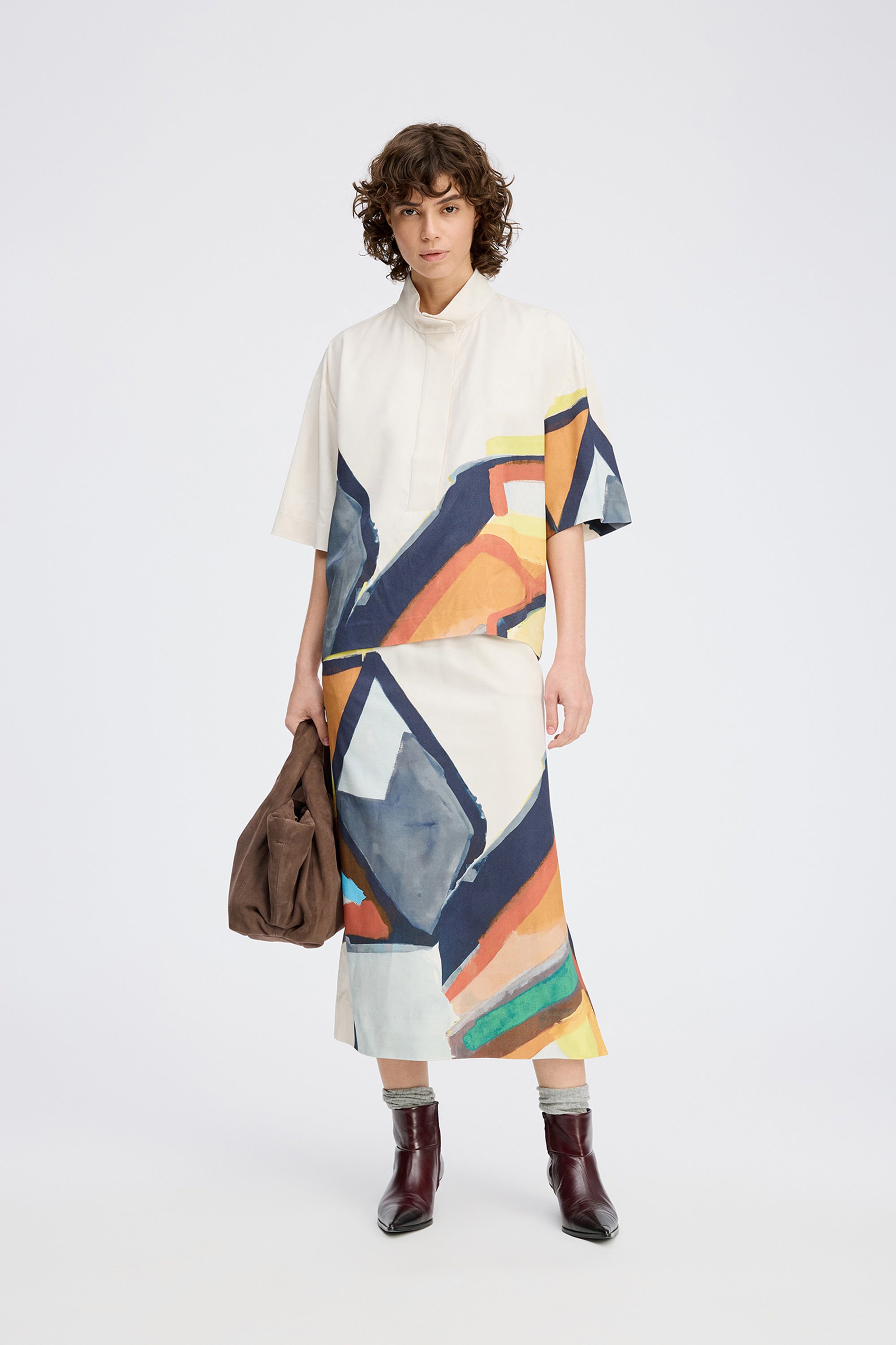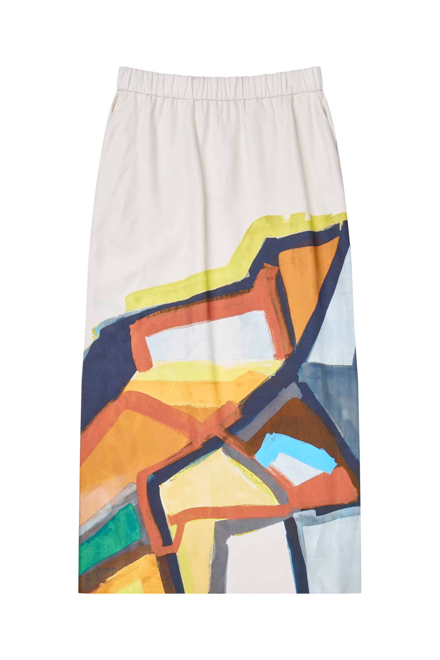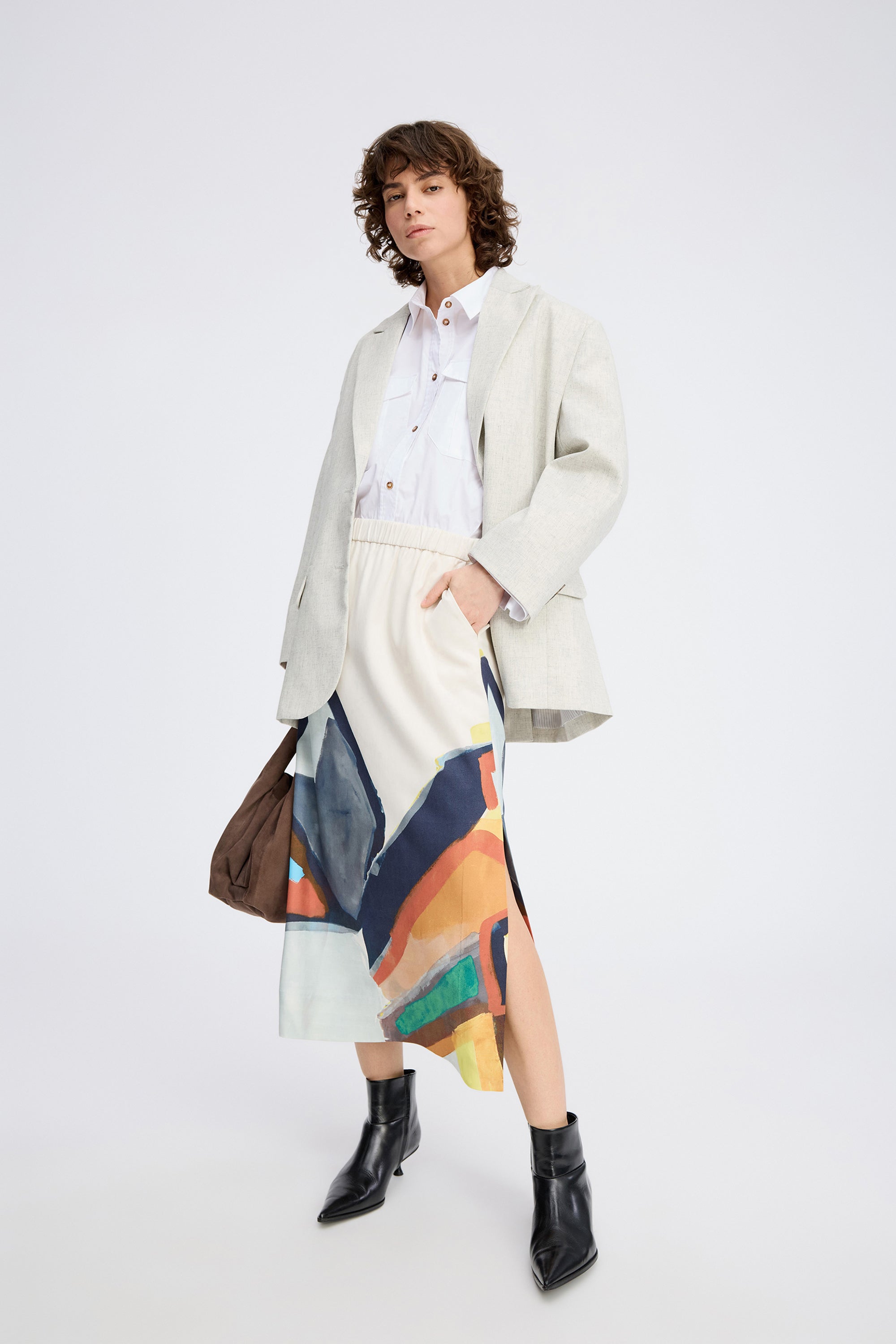 Beautiful skirt with an elegant abstract graphic print. Designed with an elastic waistband, a slit, and stylish side pockets.