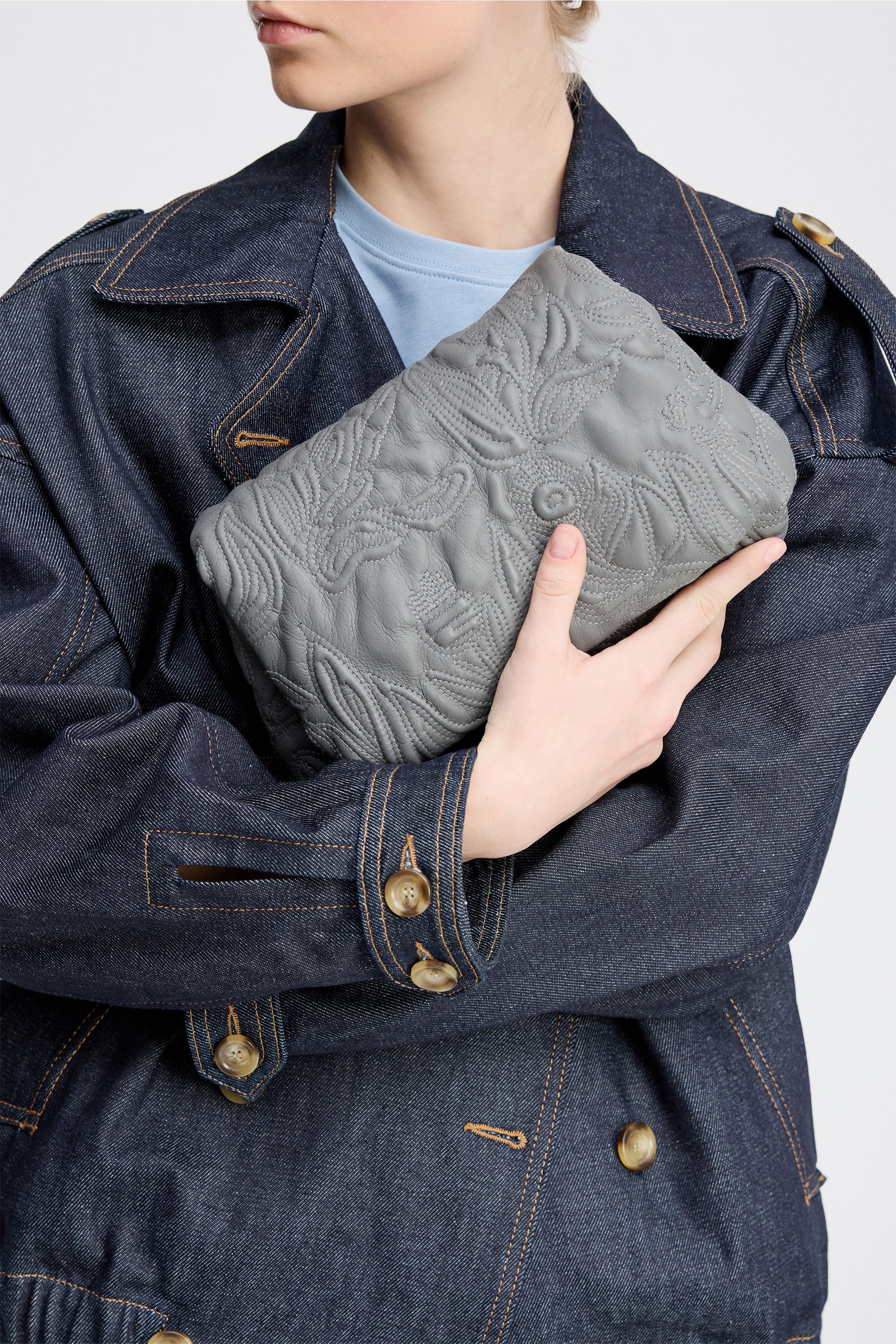 Shoulder bag in soft leather with a beautiful quilted floral pattern. The bag features a spacious main compartment, several practical inner pockets, and an adjustable shoulder strap that can be customized to fit your needs. Closes with a magnetic button.