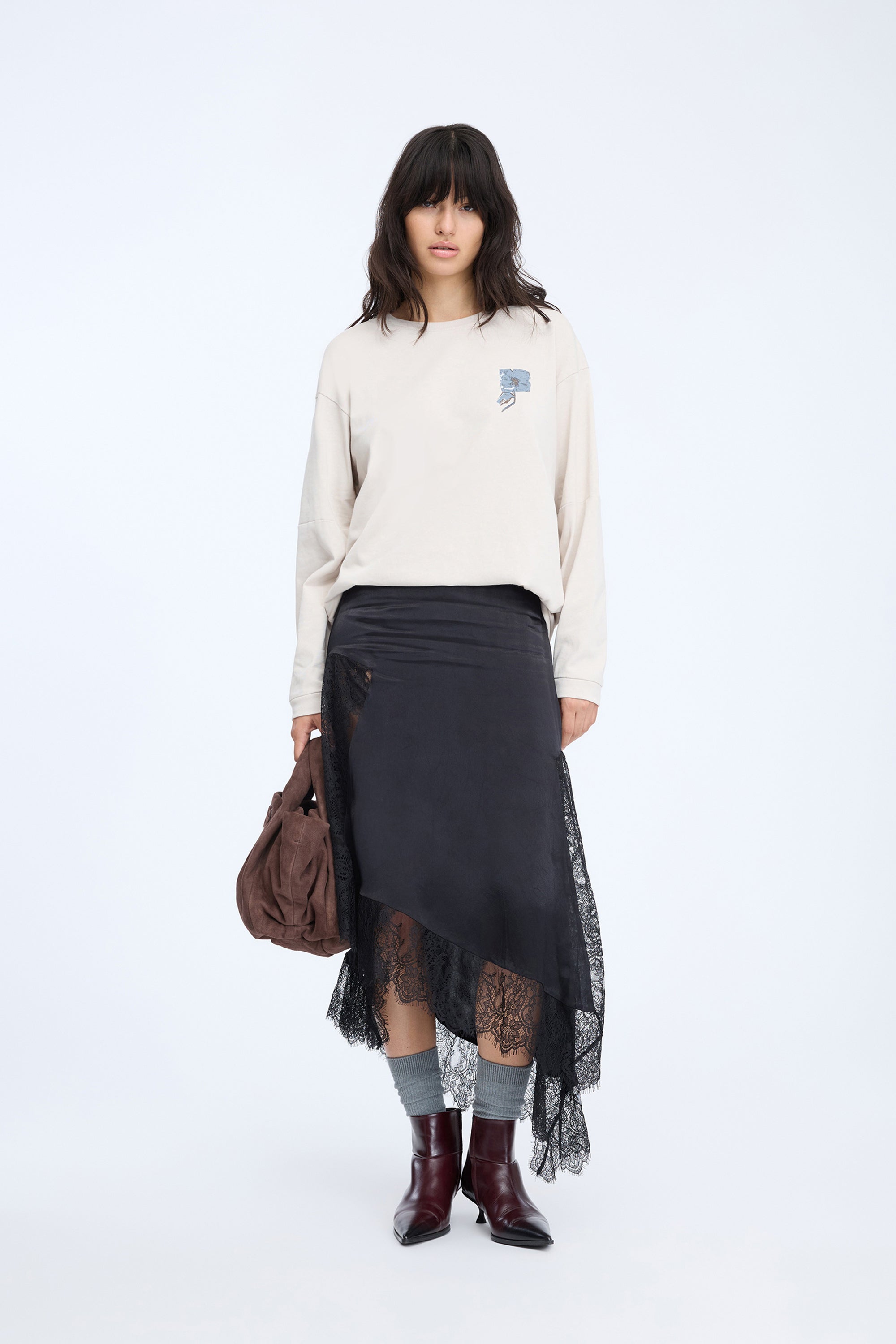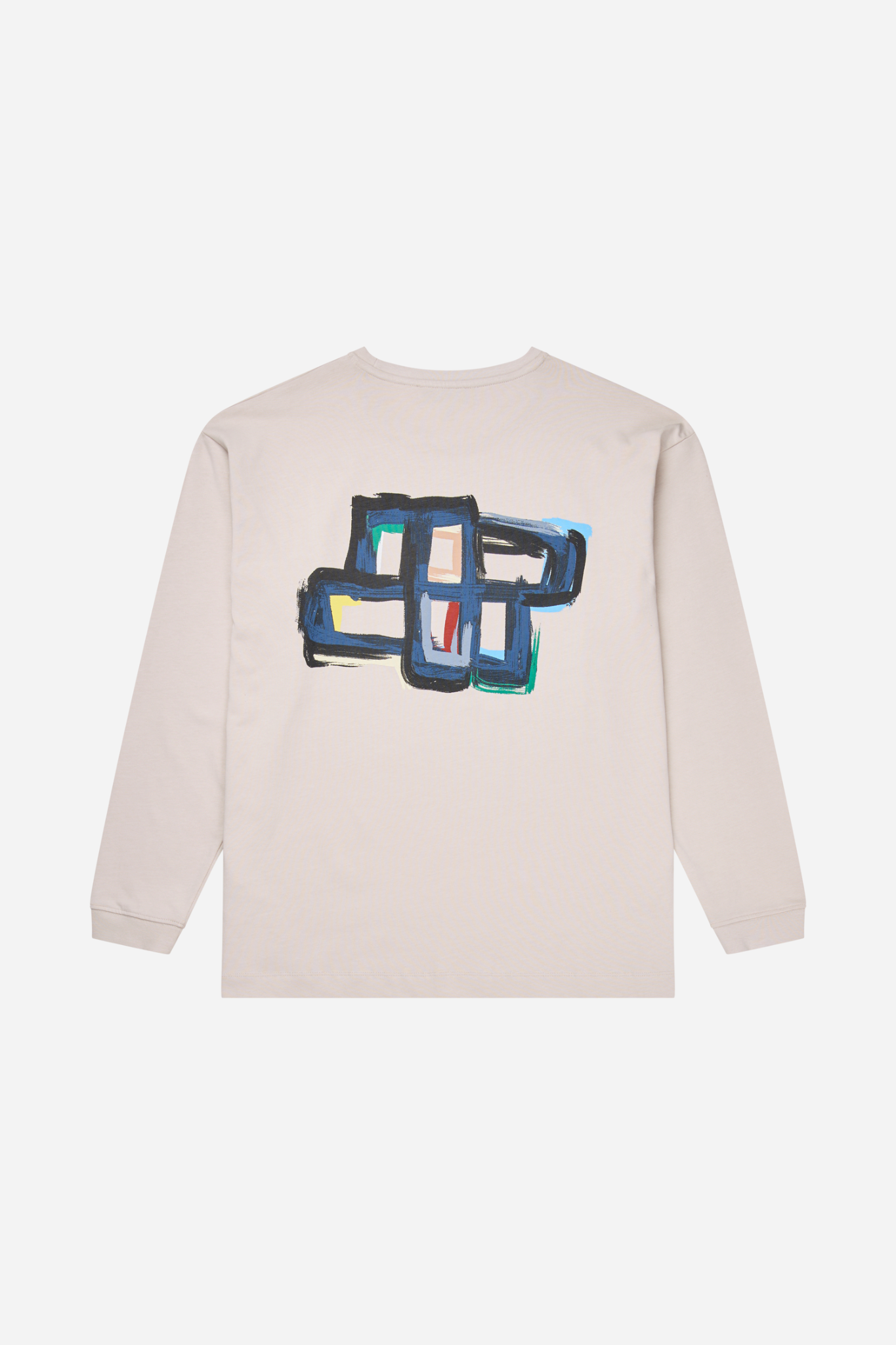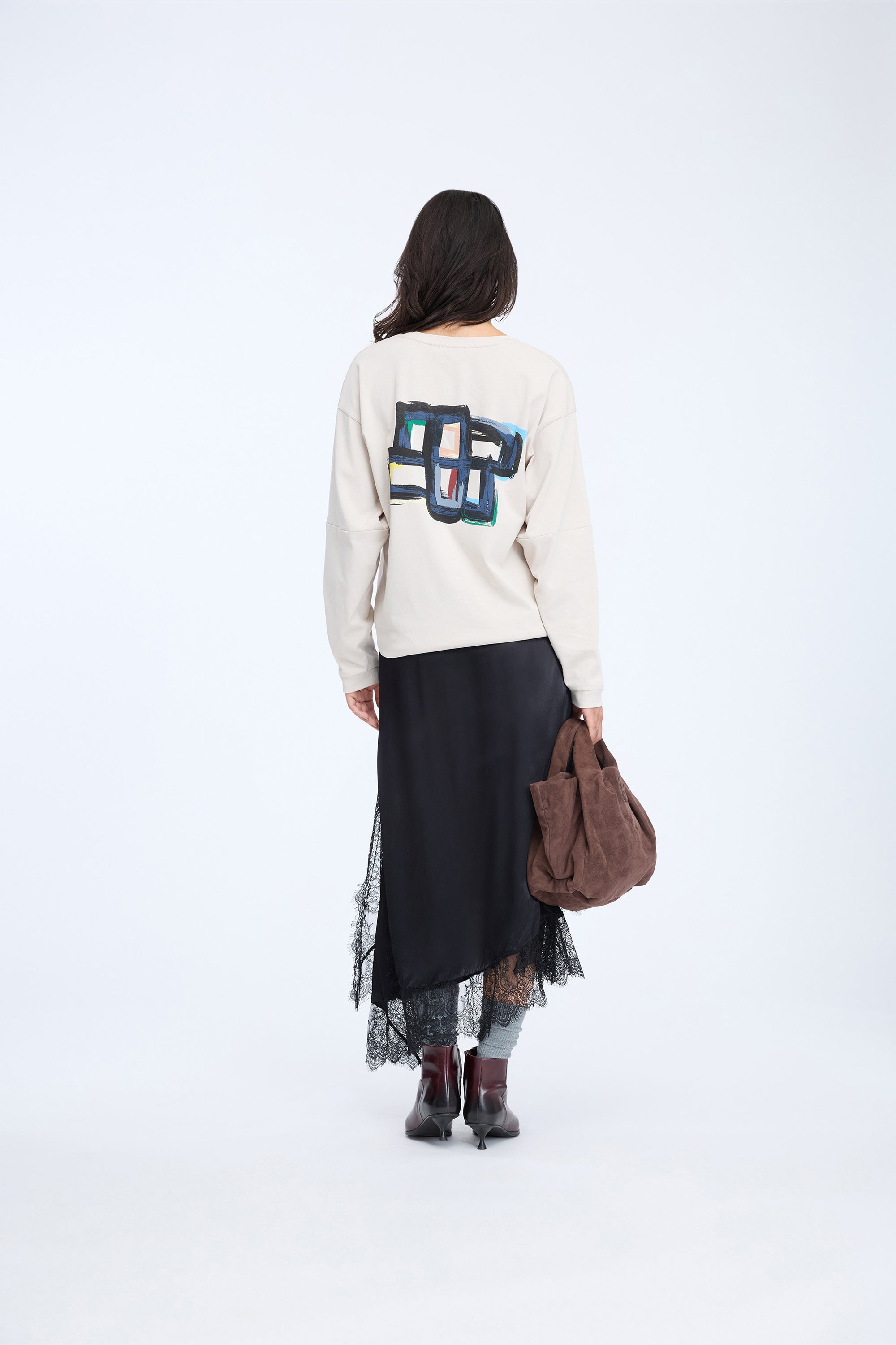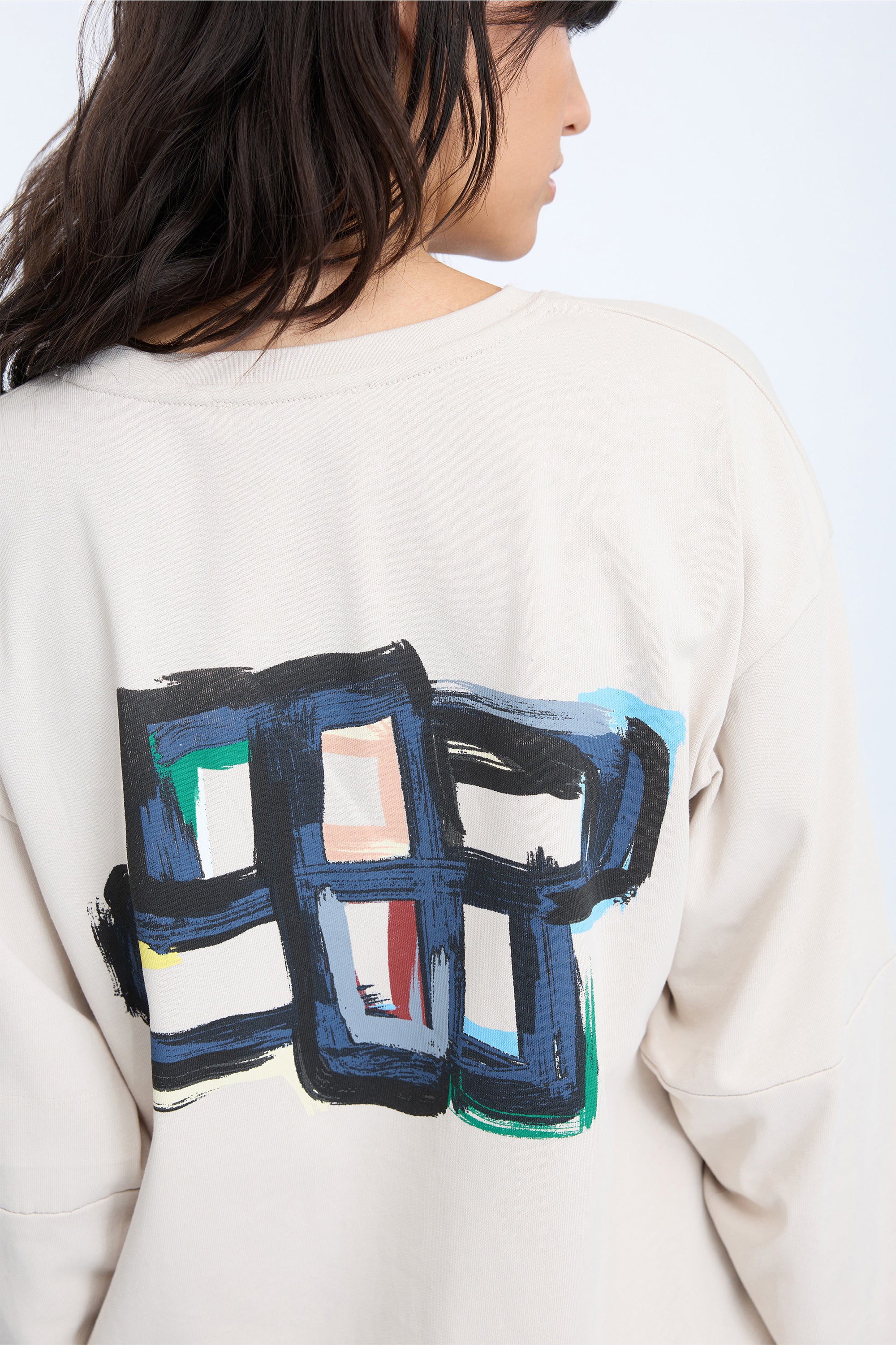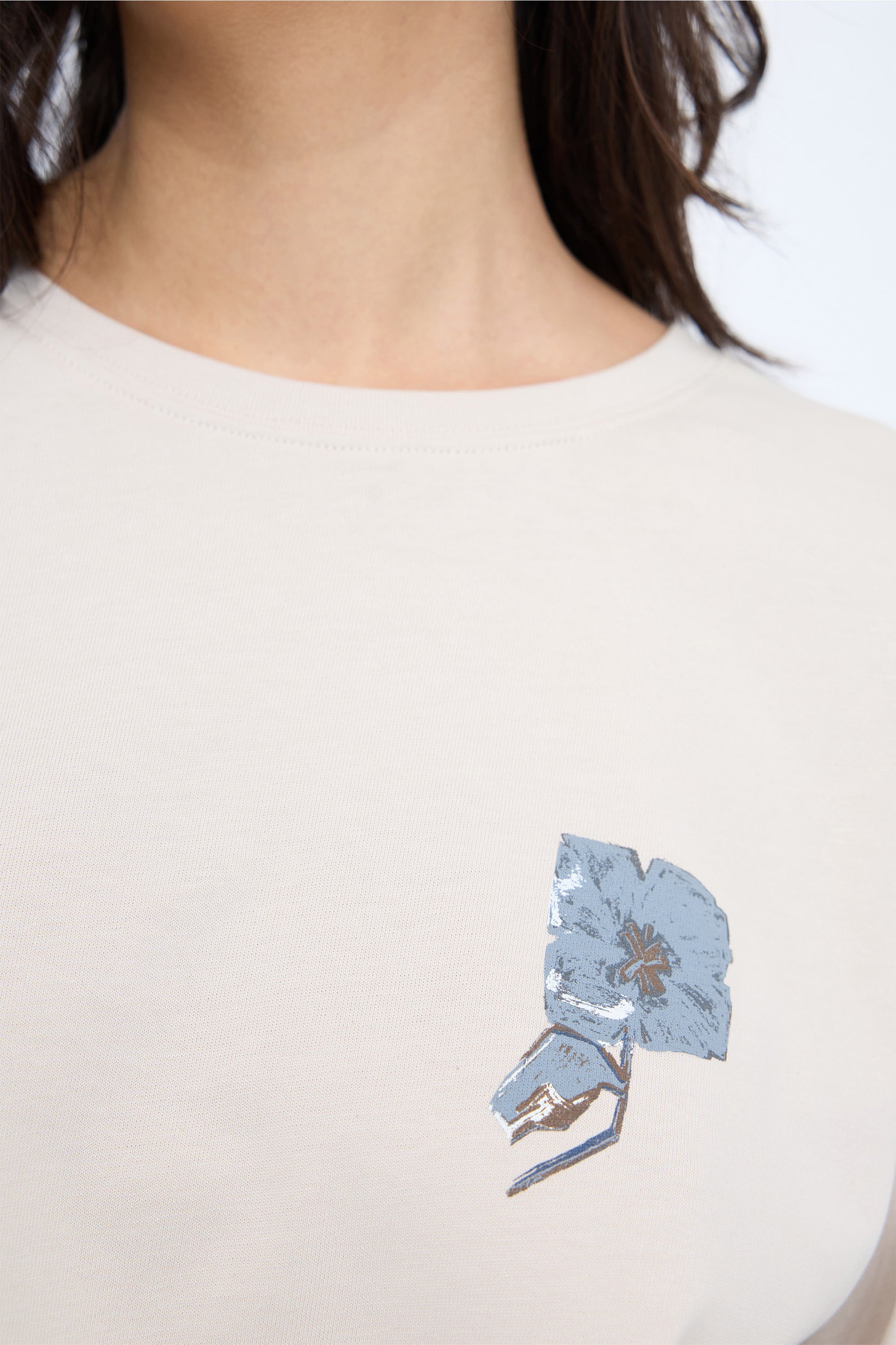 Elegant T-shirt with a small artistic flower print on the front and a beautiful graphic MUNTHE emblem on the back. The T-shirt has a loose fit, long sleeves, and a round neckline.