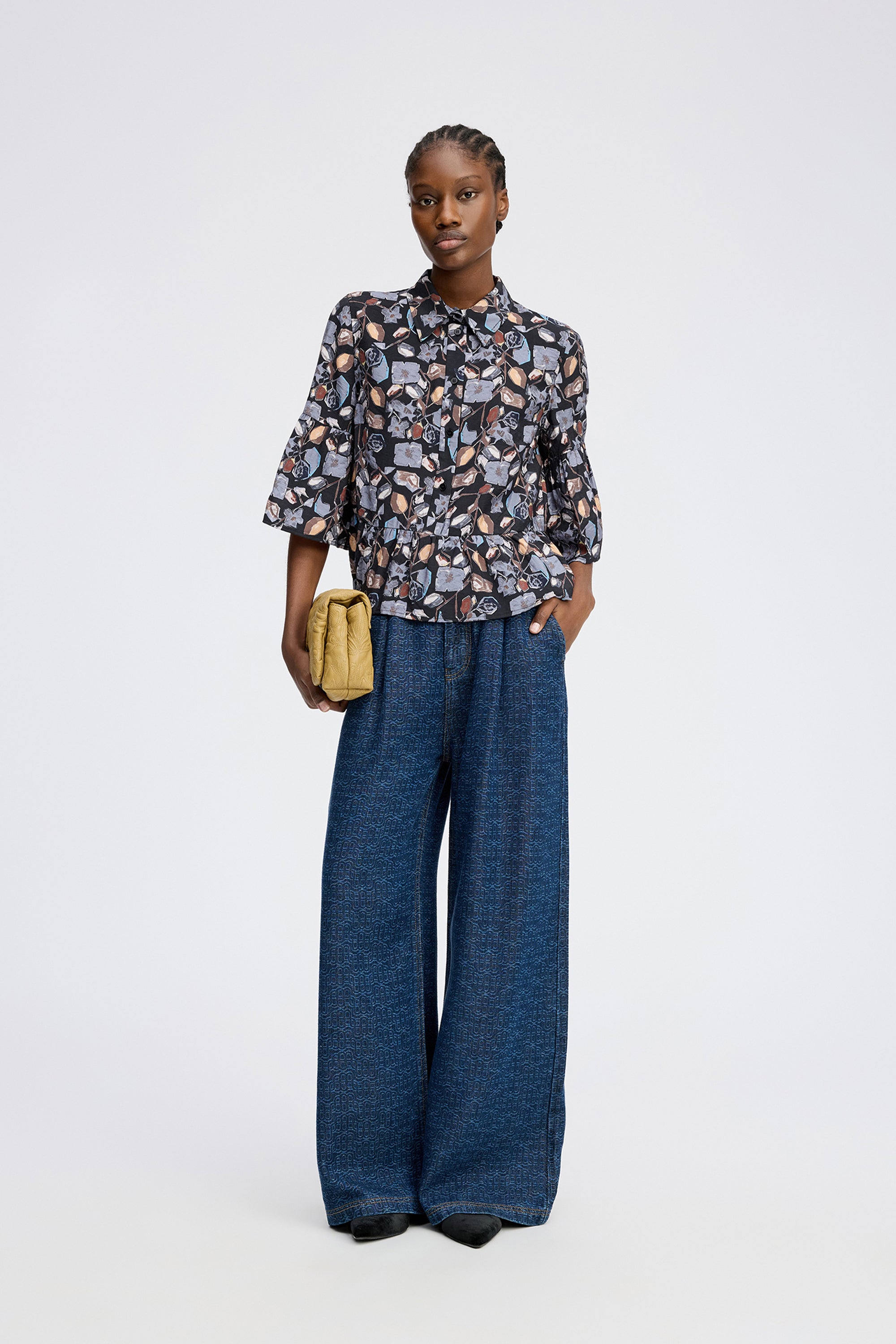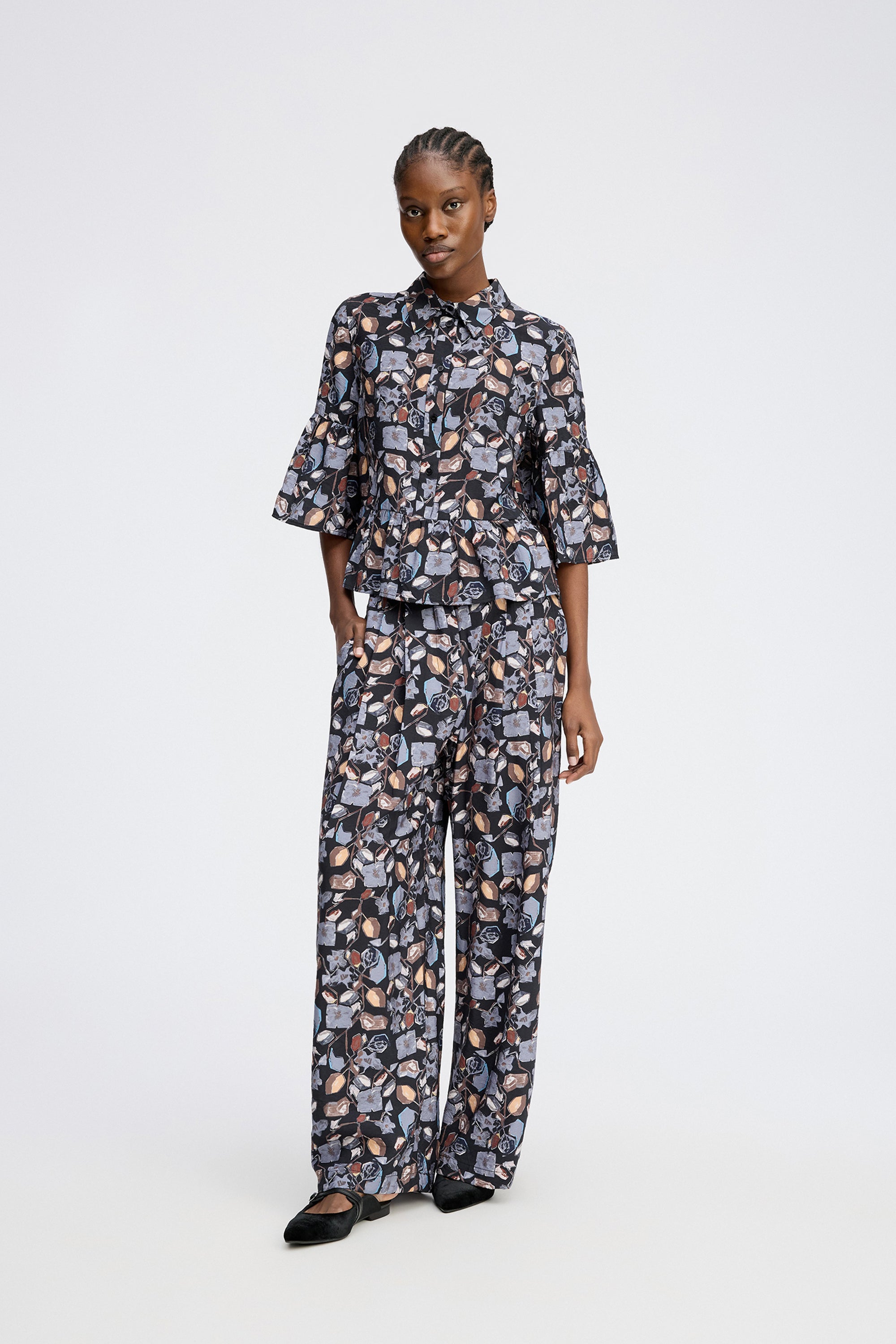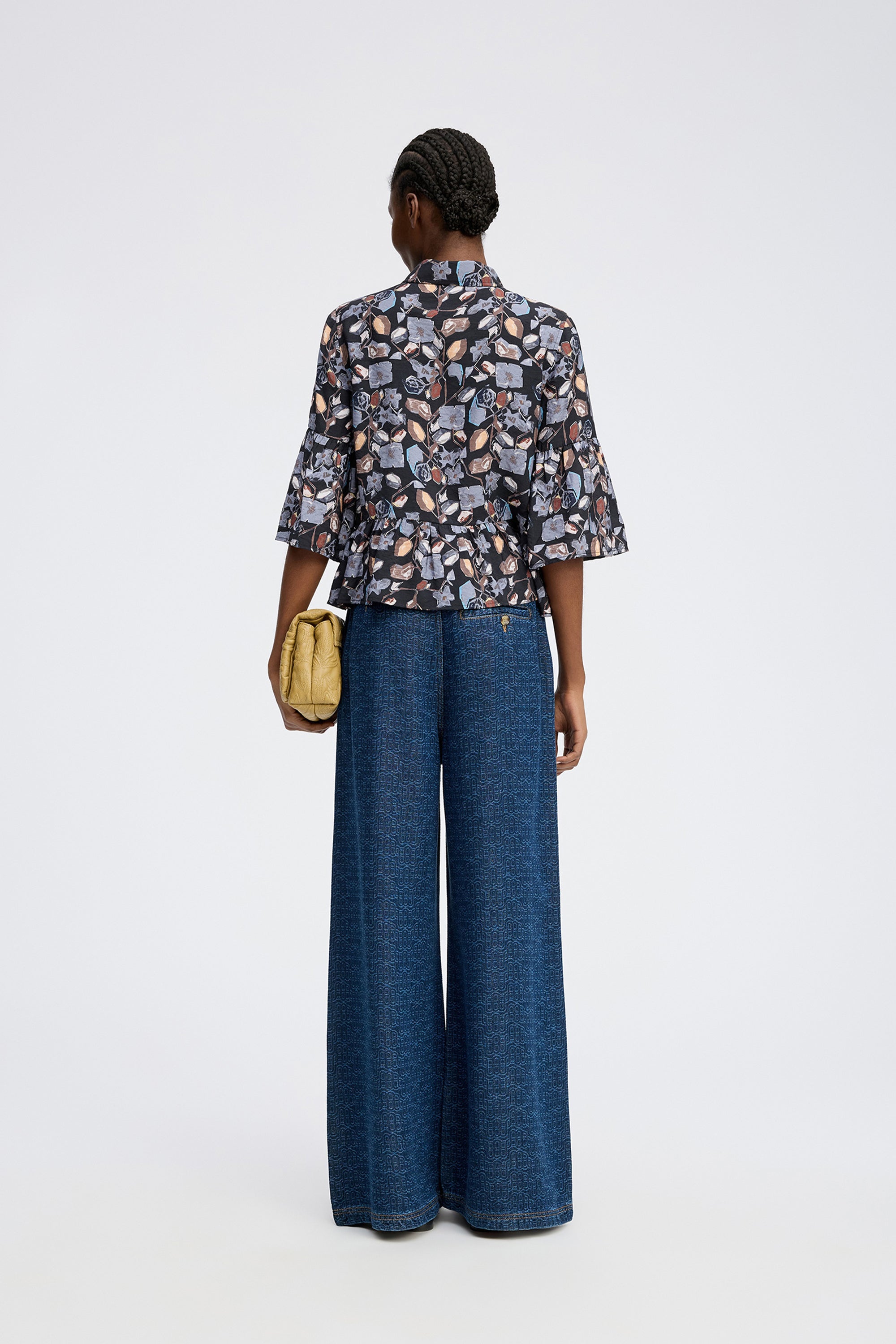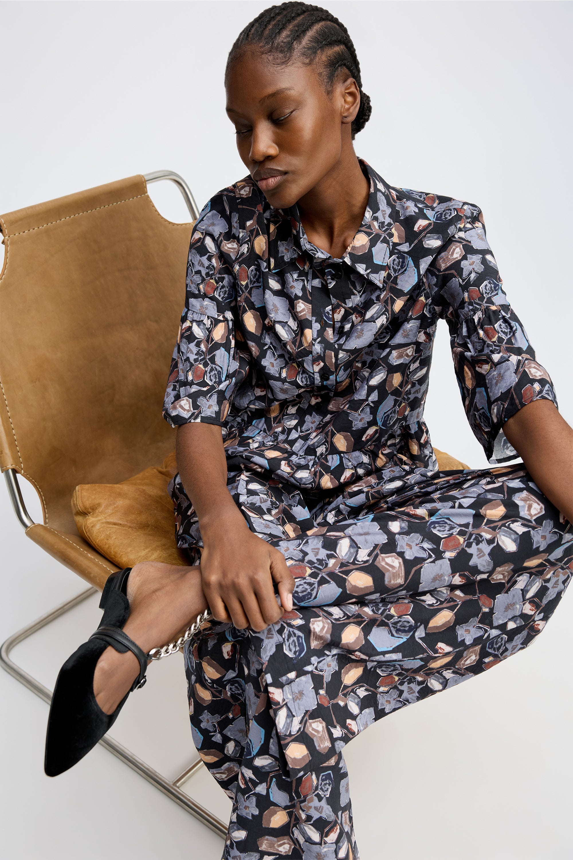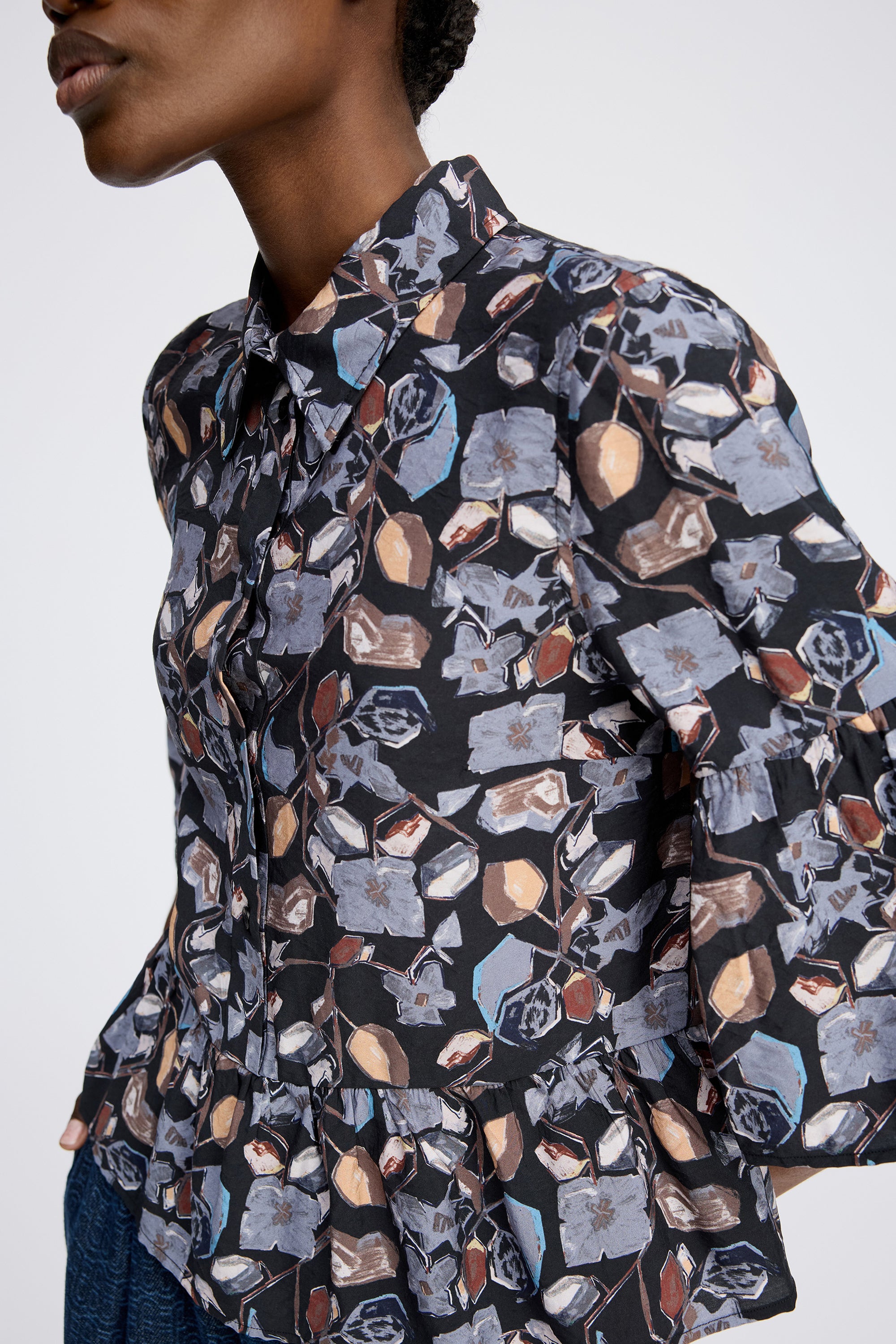 Feminine shirt blouse with a beautiful floral print. Designed with a classic collar, wide 3/4-length sleeves, and an elegant peplum waist. The blouse buttons up to the middle.