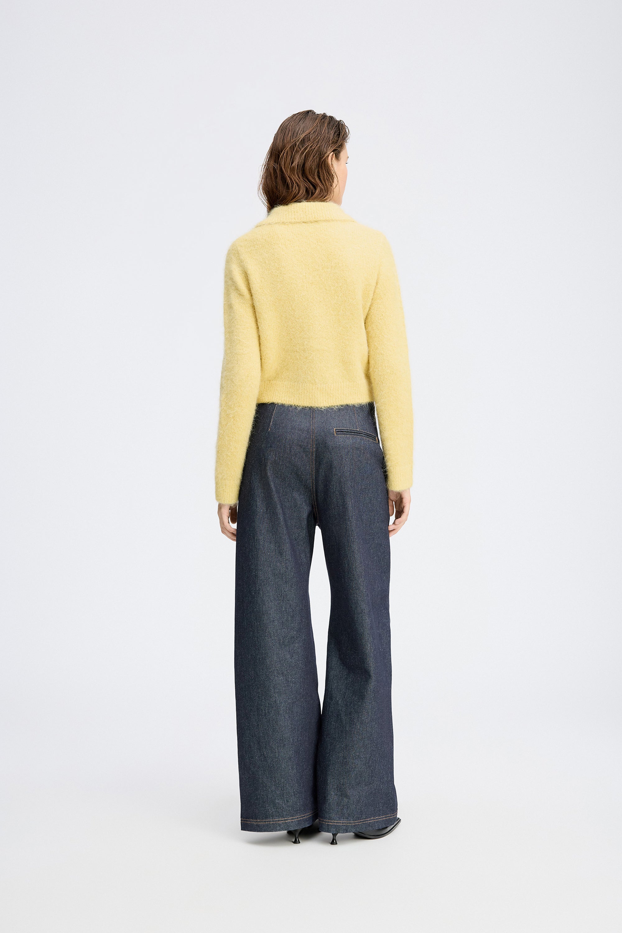 Beautiful, soft cardigan with an elegant collar and ribbed edges at the sleeves and hem. The knit is designed with a deep V-neckline and front button closure.