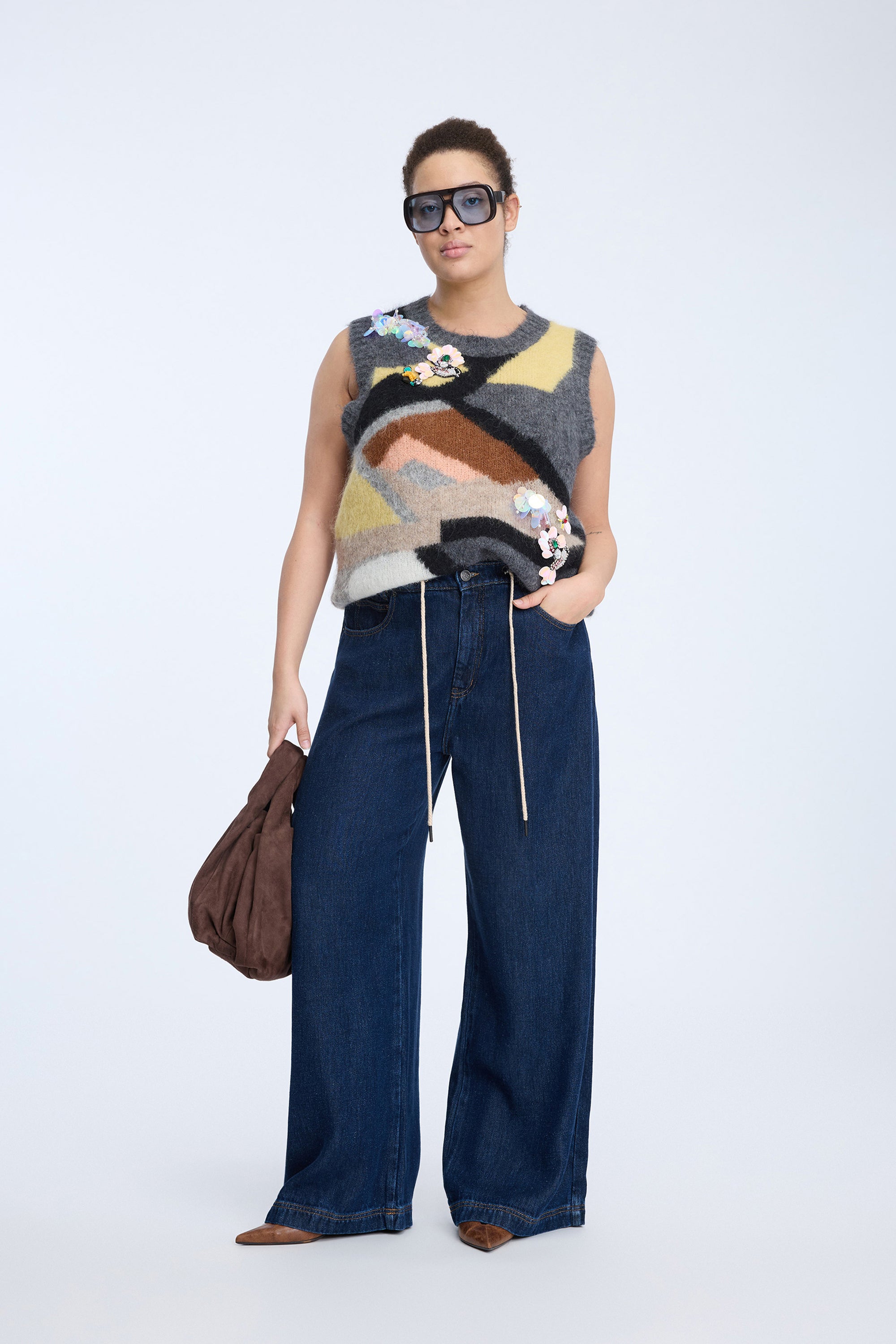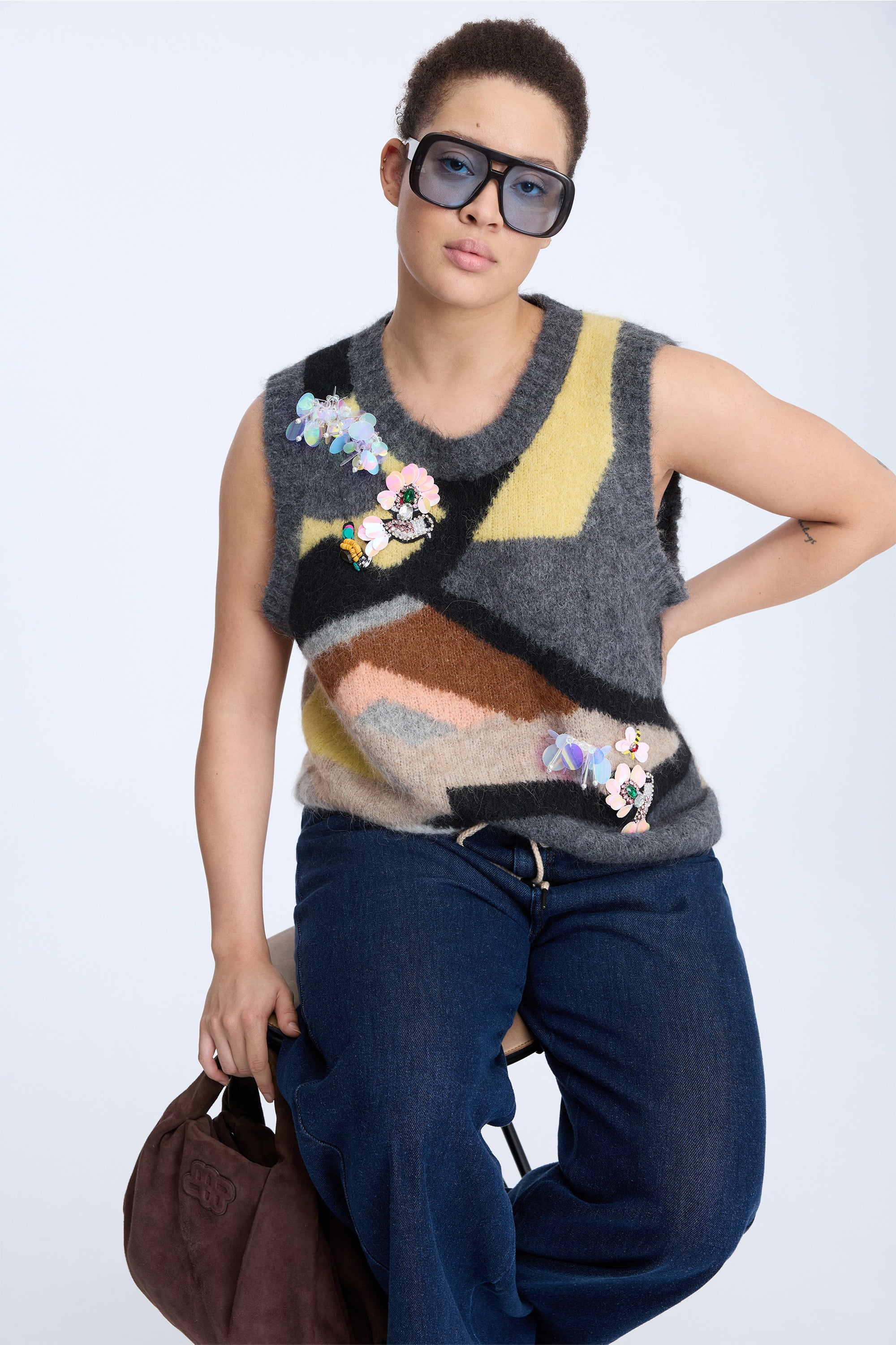 Beautiful, soft knitted vest with an elegant, abstract pattern in grey, yellow, and earthy tones. The vest is adorned with sparkling appliqués and floral details, creating a beautiful and artistic expression.