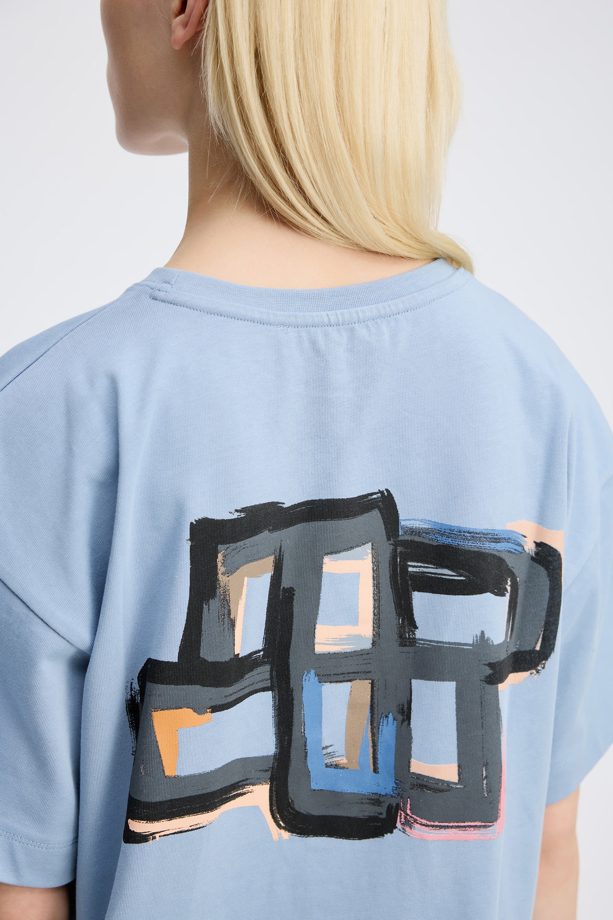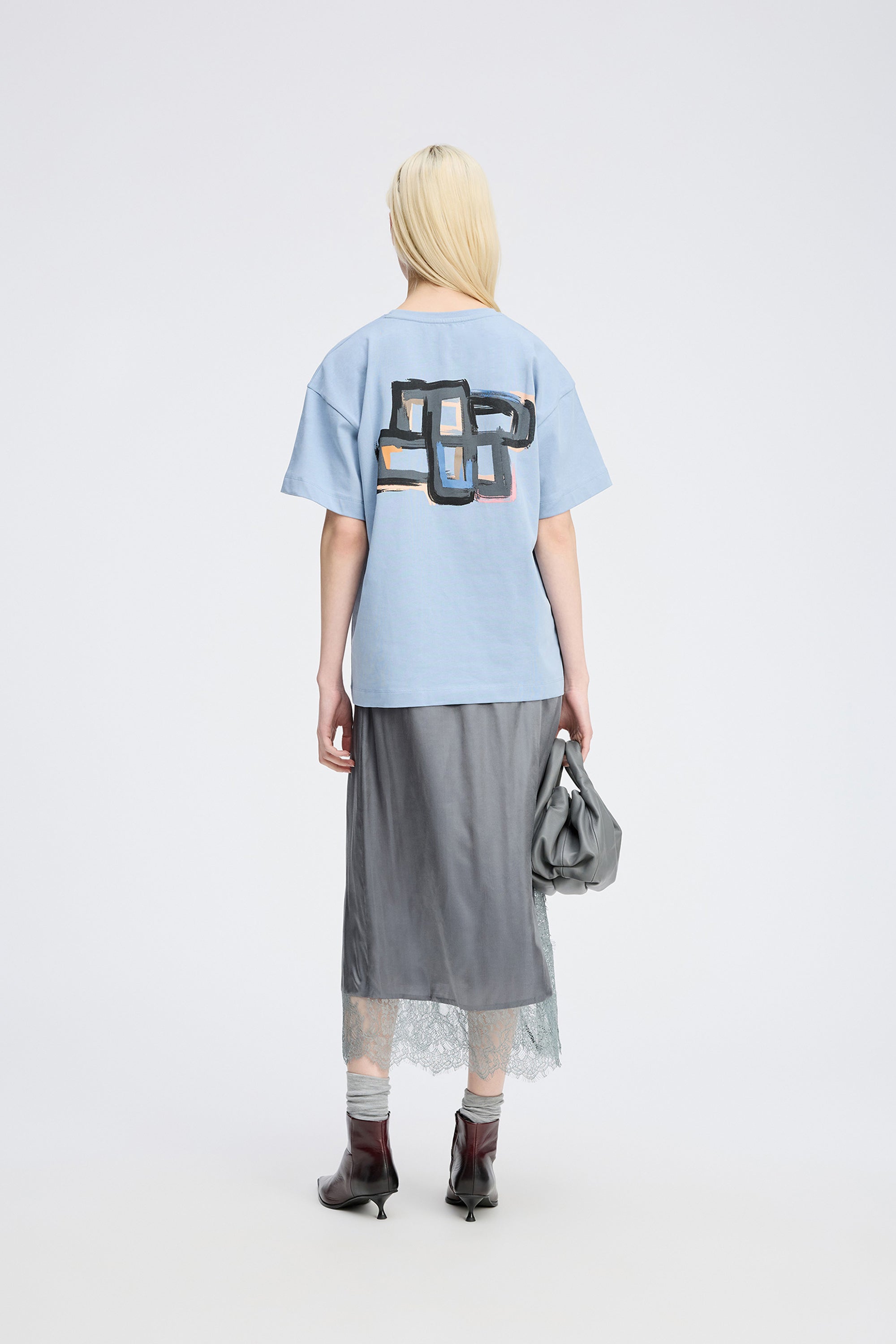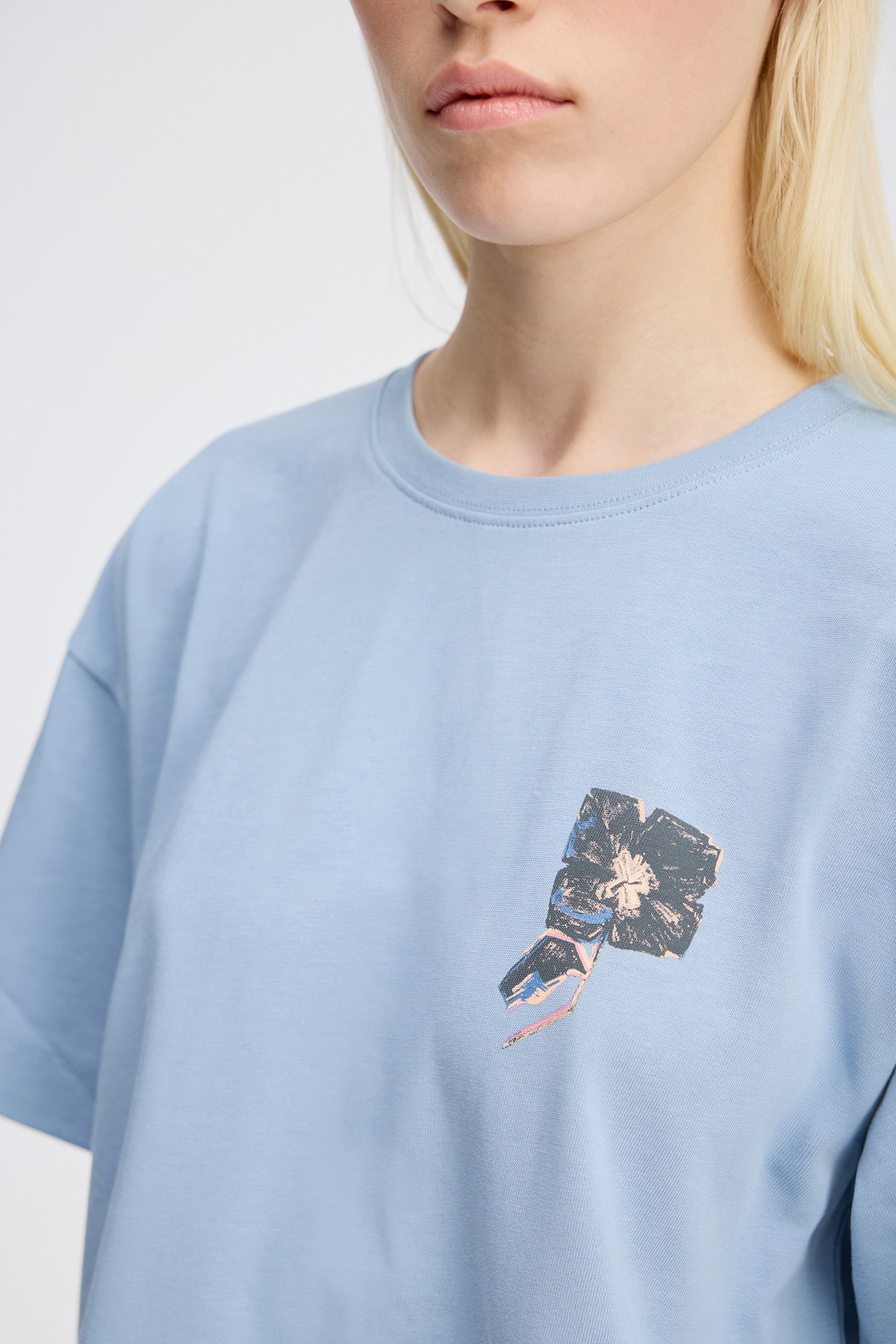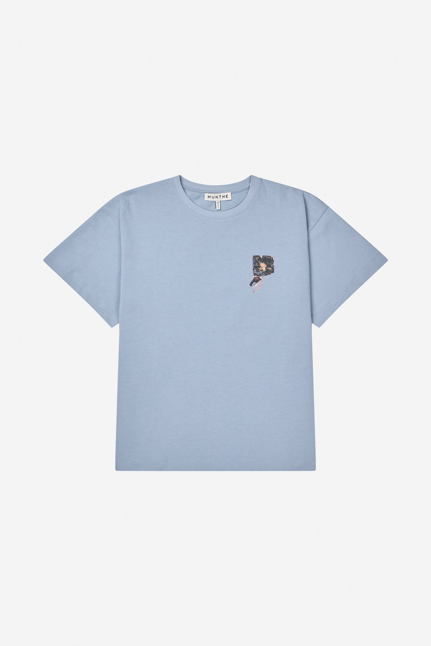 Elegant T-shirt featuring a small artistic flower print on the front and a beautiful graphic MUNTHE emblem on the back. The T-shirt has a loose fit, short sleeves, and a round neckline.