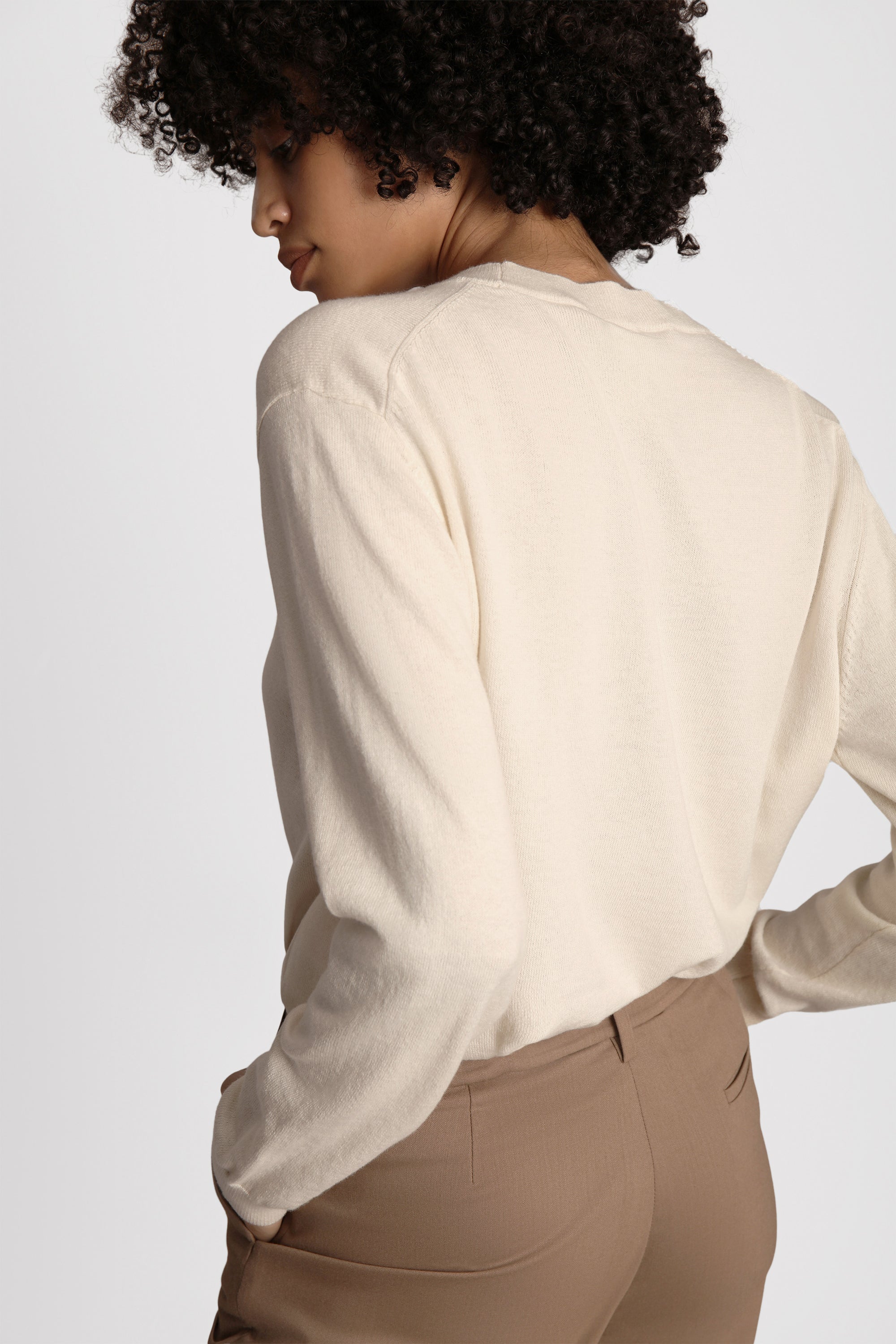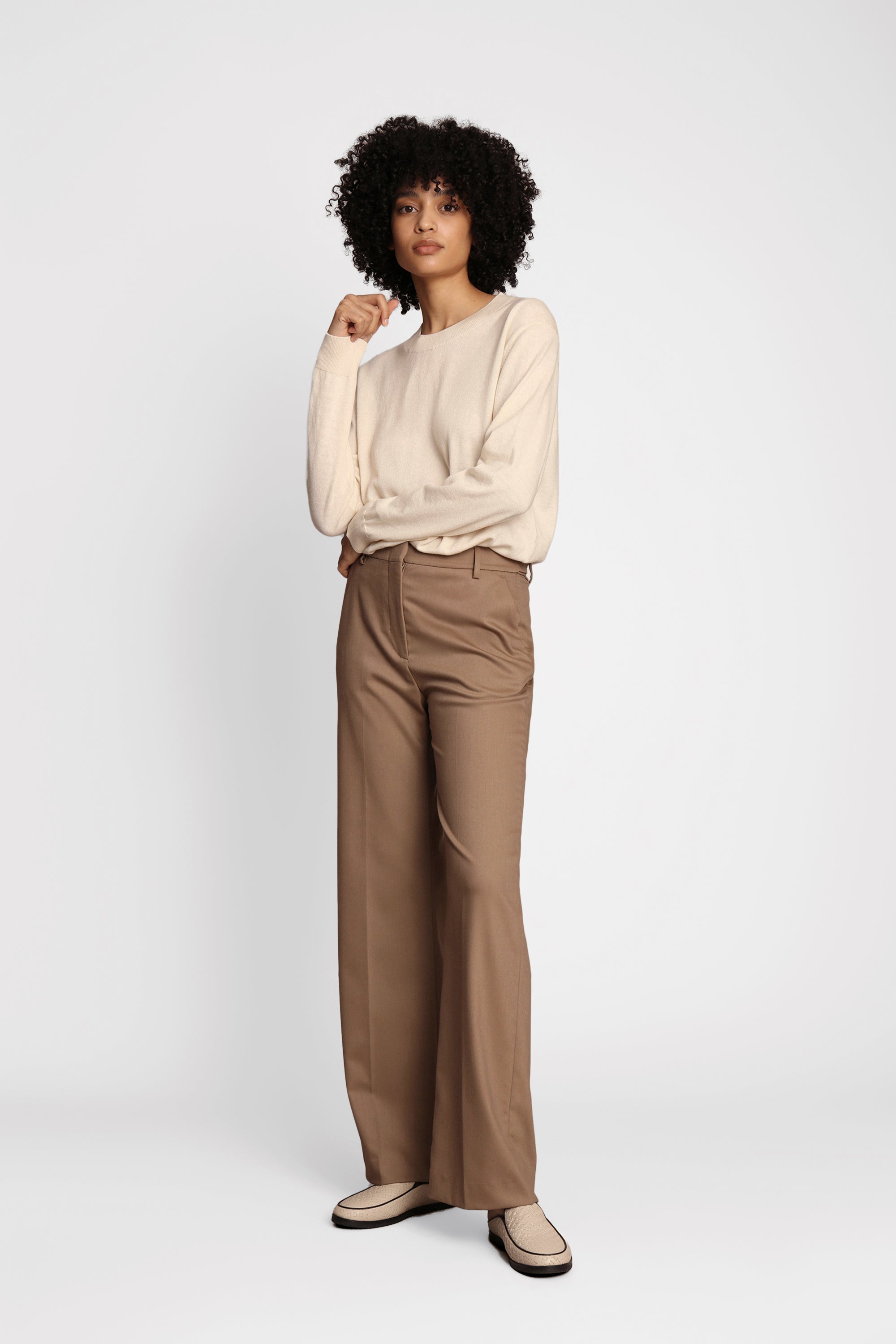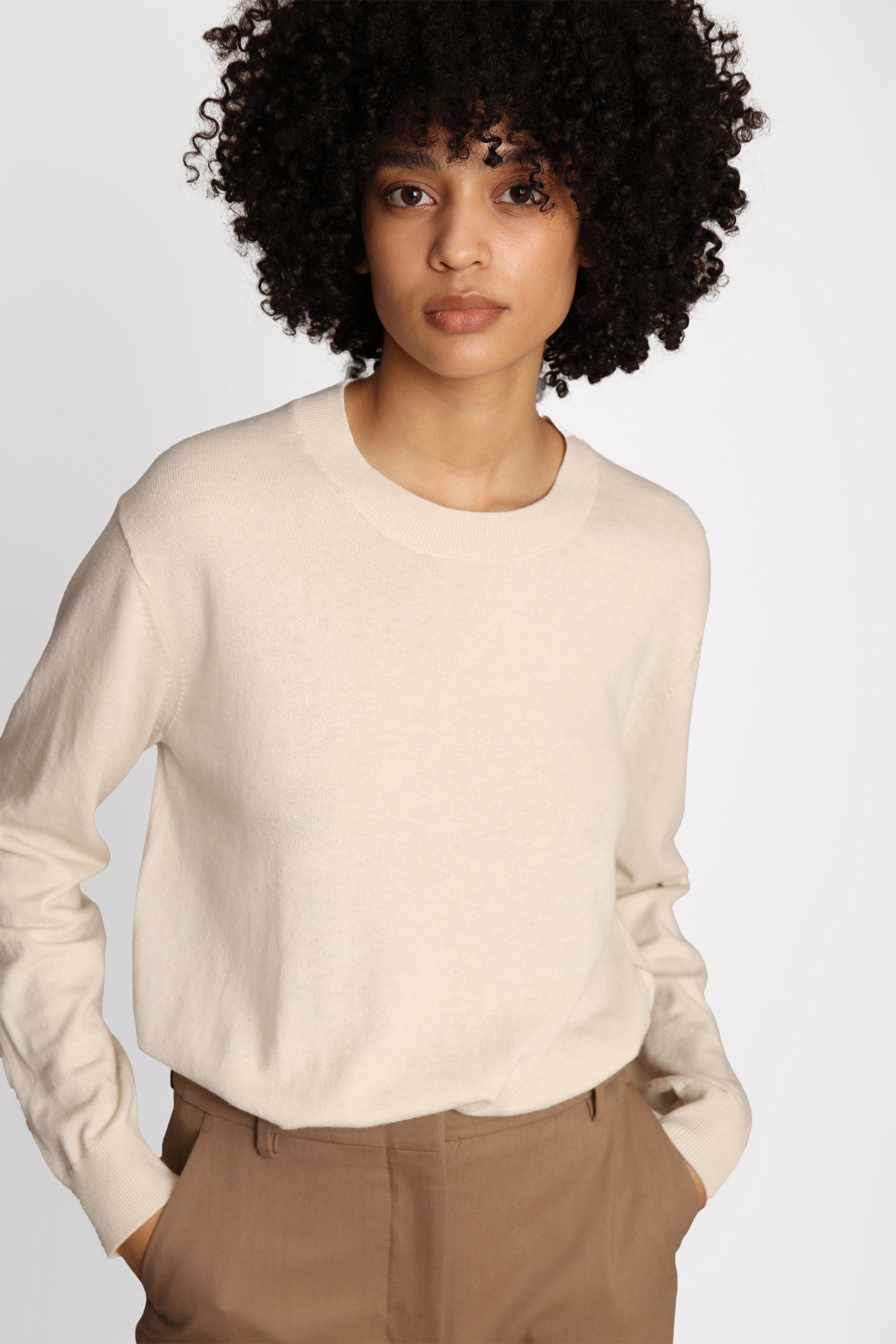 Classic light knit made from a soft merino wool blend. The knit has long sleeves, a round neck, and an elegant rib along the edges.