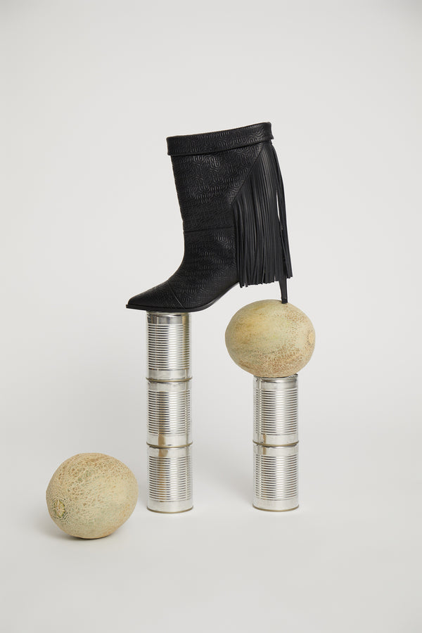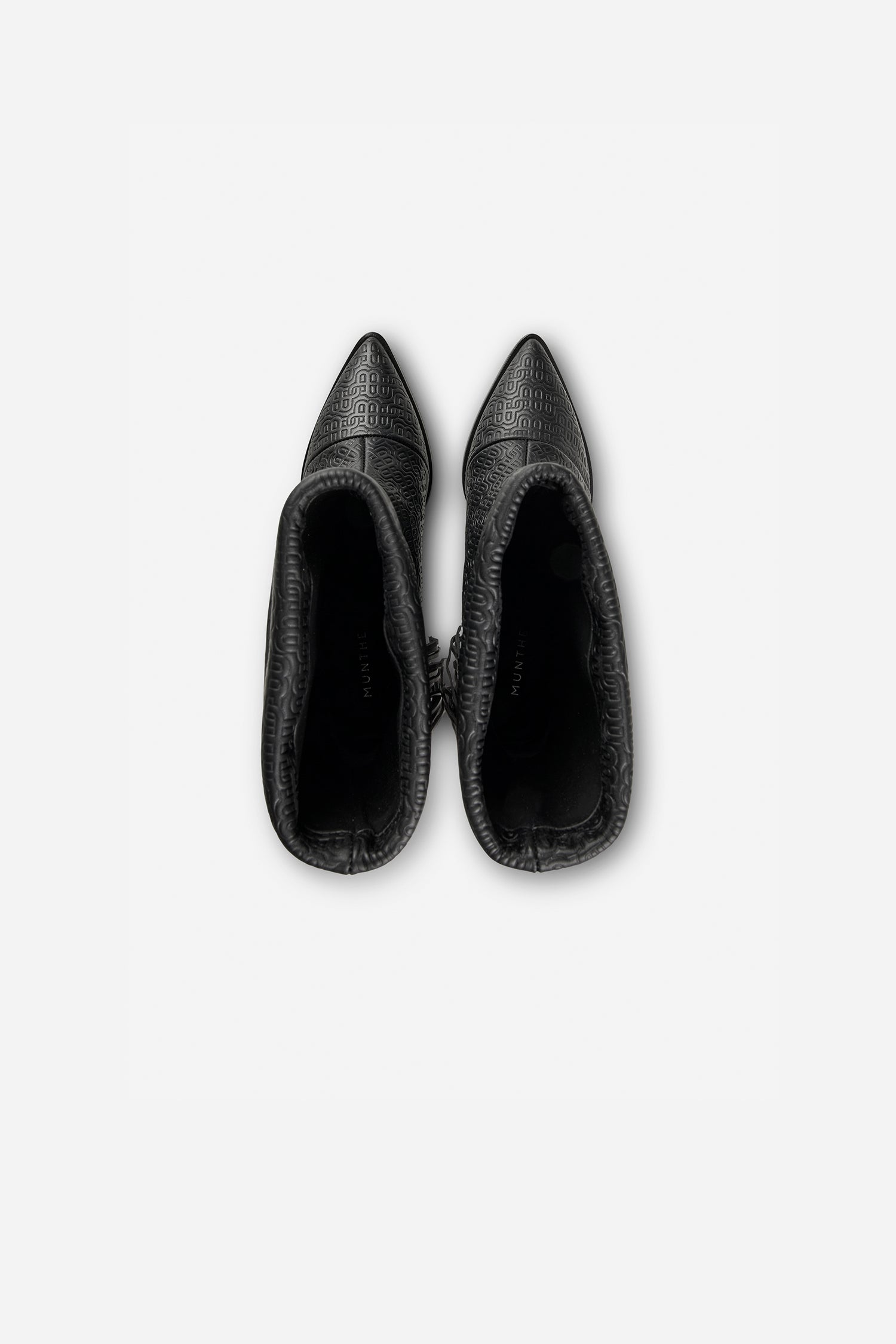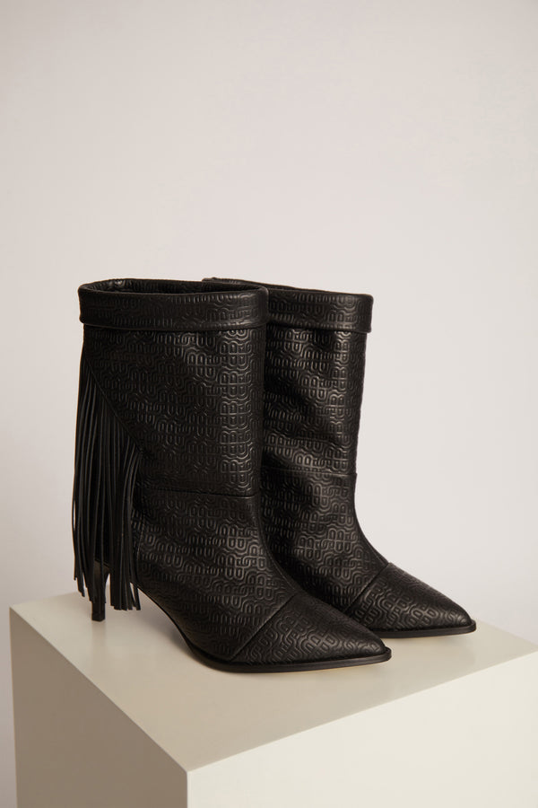 MUNTHE emblem boots, with an elegant heel and beautiful tassels that cover the top part of the heel. These boots are designed with a fold at the top of the shaft, a medium-high heel and a pointy nose. They are made of 100% leather.