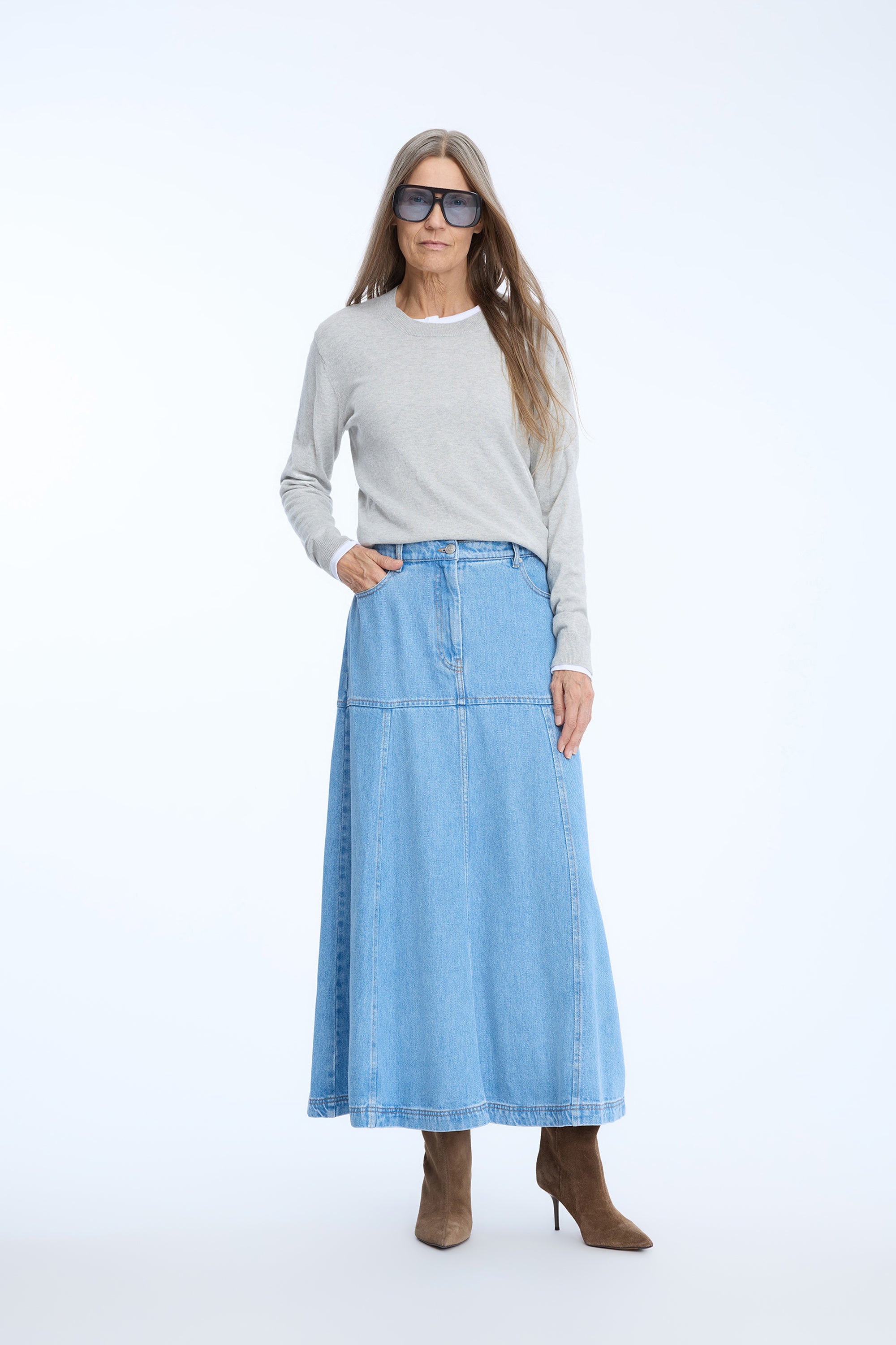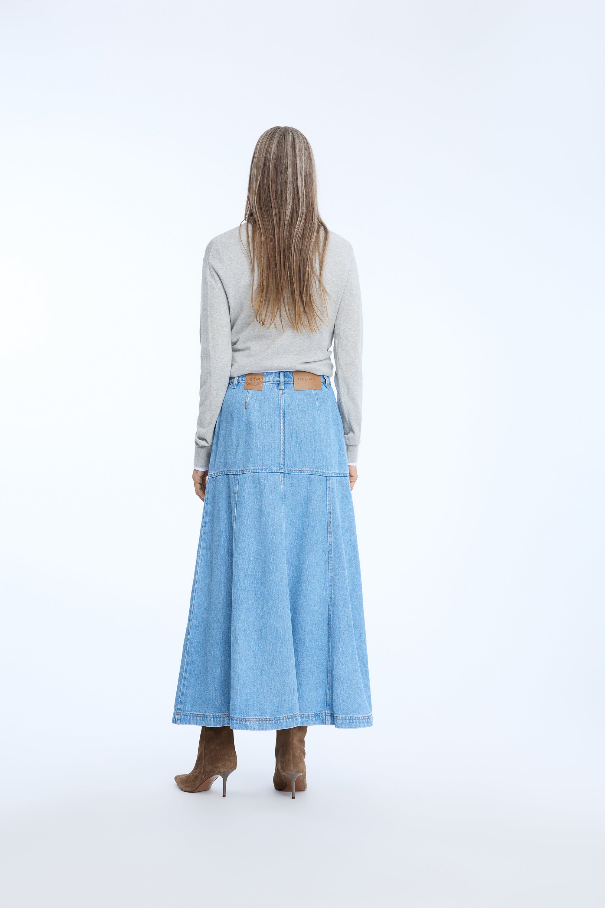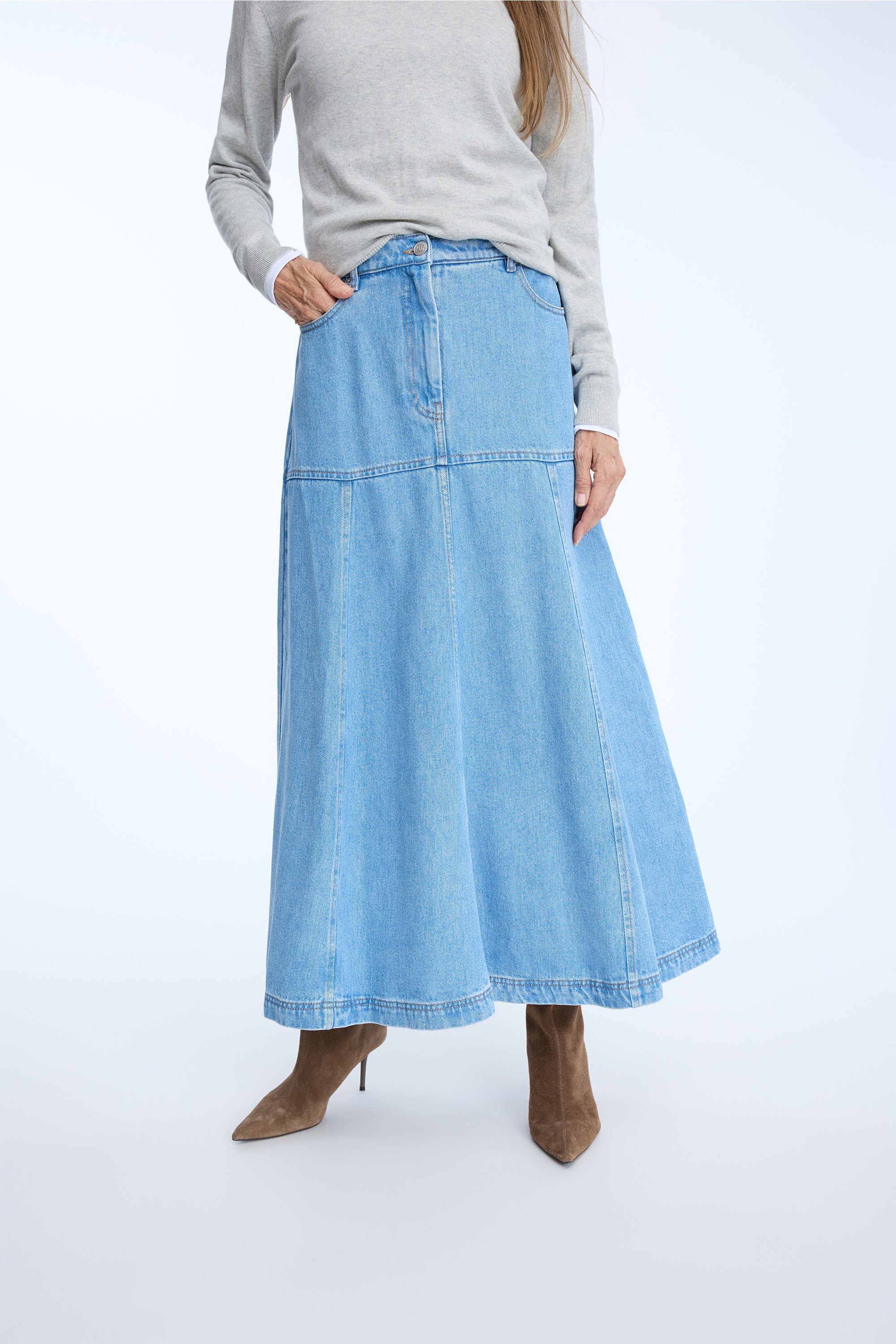 A beautiful denim skirt with a tight fit around the hips, and a contrasted flair effect from the hips and down. The skirt is designed with belt loops, pockets and has a regular fit.