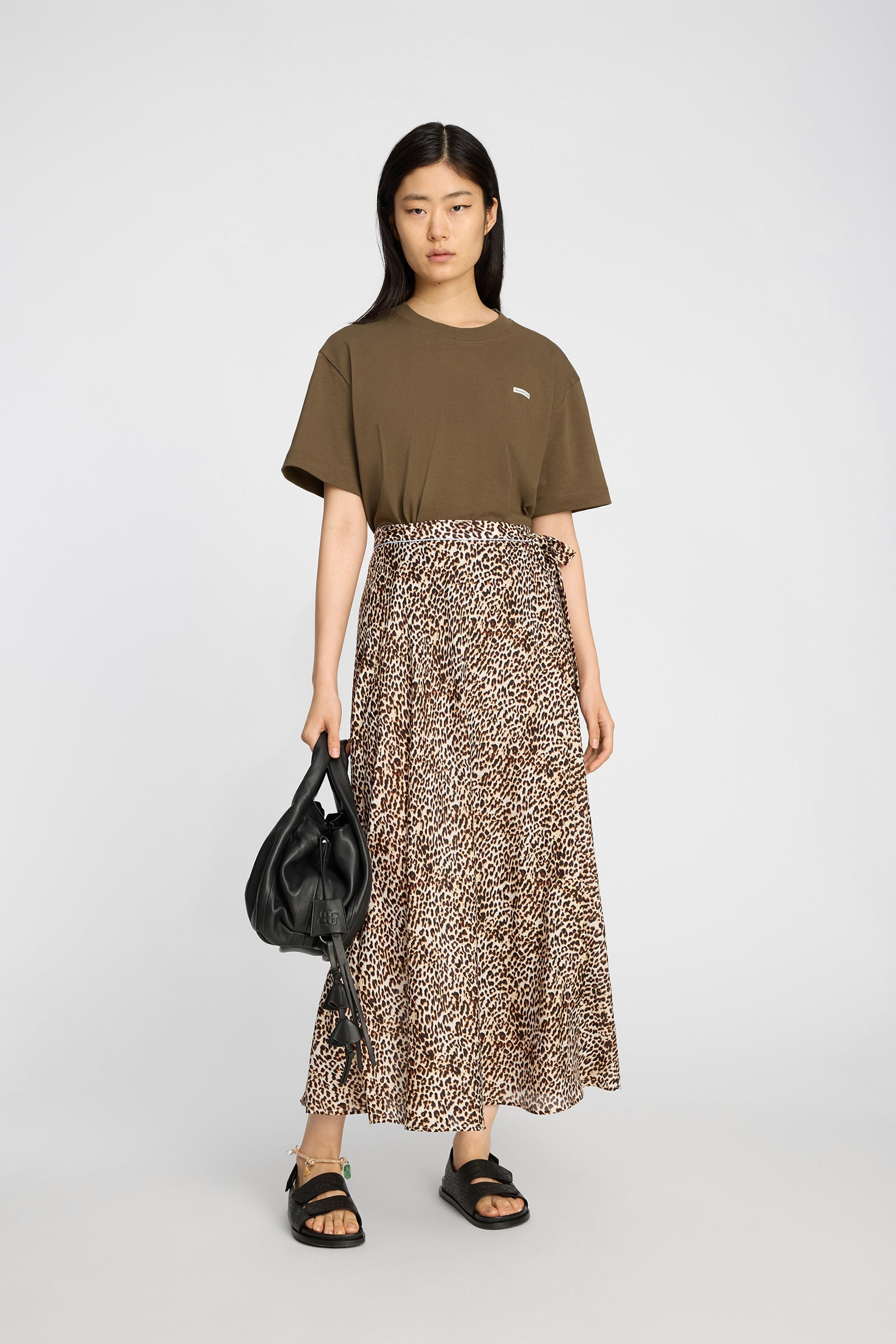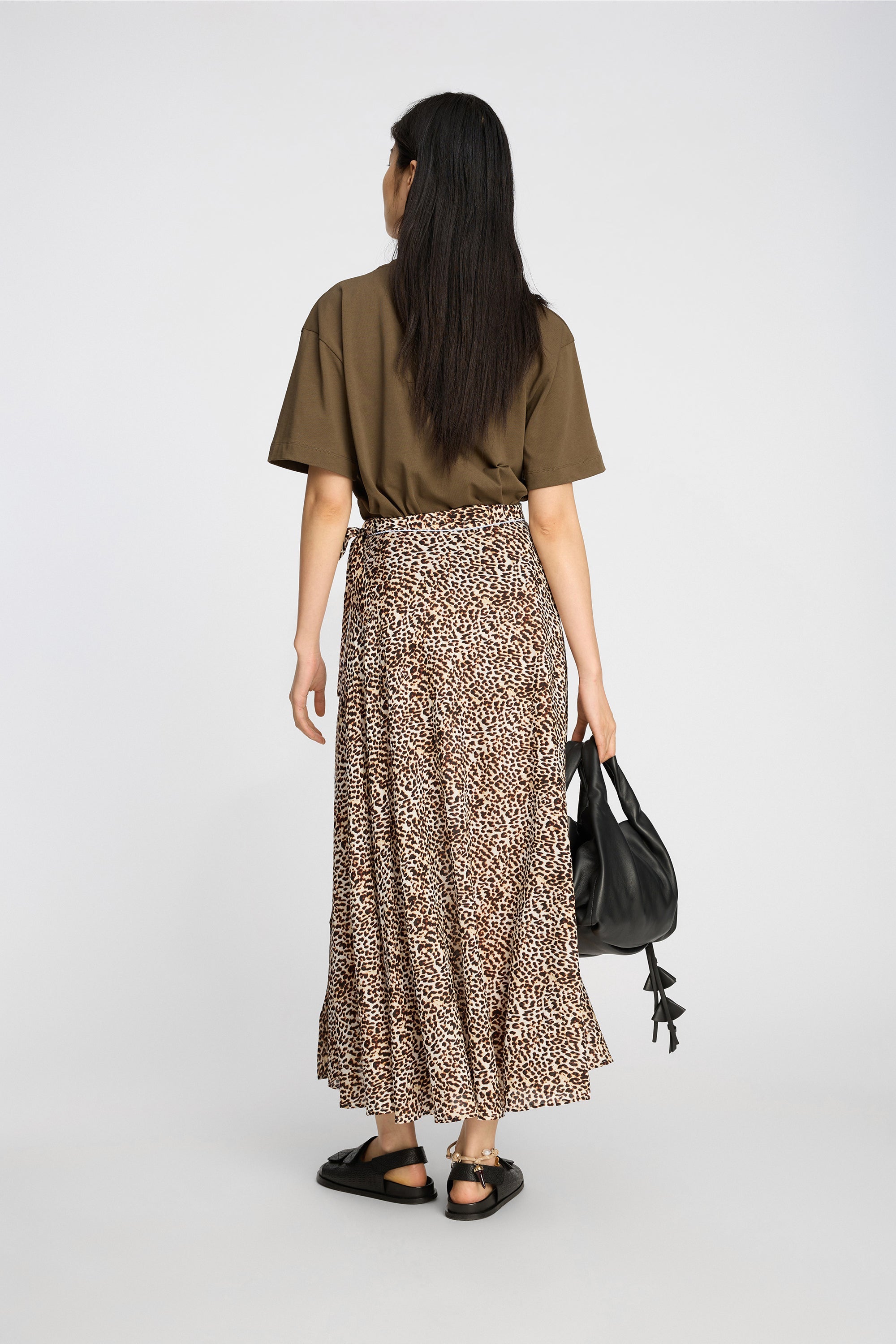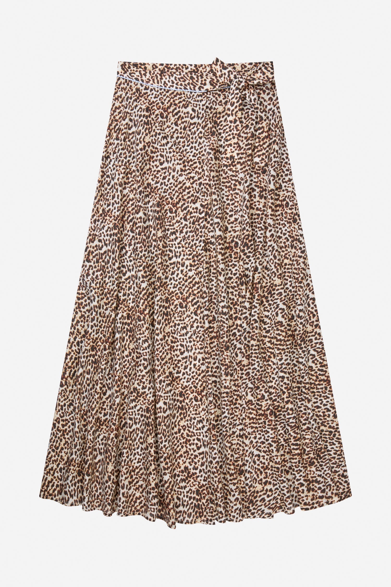 Skirt with a dense leopard print, crafted from a lightweight woven material with a long A-line shape, defined waist, and side bow detail.