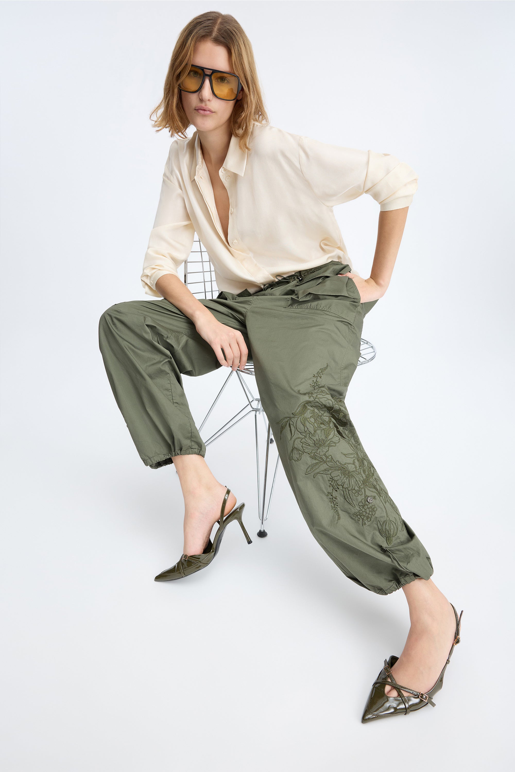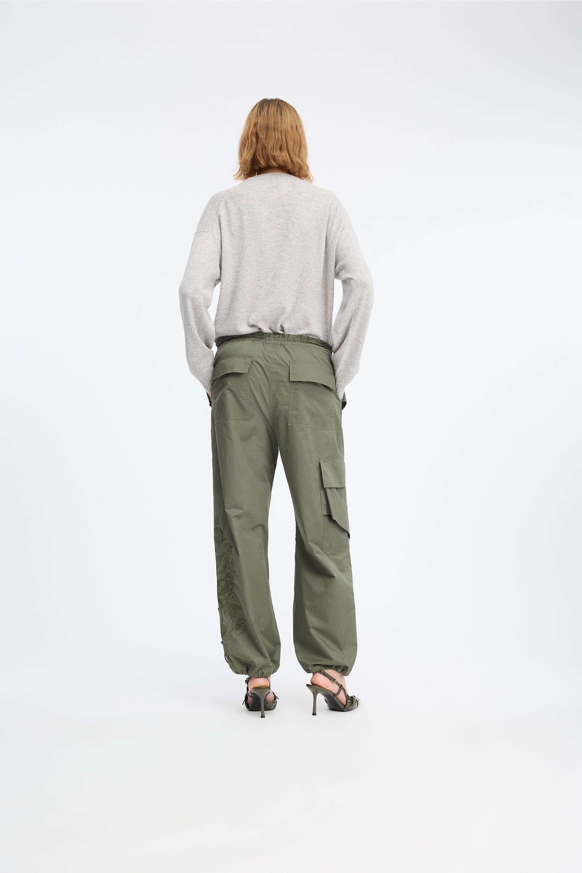 Cargo pants designed for a loose fit, with a beautiful tone in tone embroidery on the leg. These trousers are designed with elegant flap pockets along the legs, hips and back. The trousers can be adjusted at the waist, as well as at the bottom of each leg, with an elegant drawstring detail.